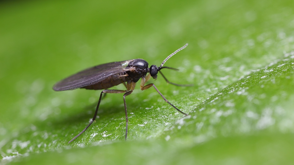 Trauermücken sind kleine, 3-5 mm lange, dunkle Fliegen mit langen schlanken Antennen und langen Beinen. Sie treten häufig und vermehrt in warmen und feuchten Umgebungen in der unmittelbaren Nähe von Pflanzen auf. Im Gewächshaus können sie daher das ganze Jahr über zur Last fallen. Die Larven ernähren sich nicht ausschließlich von verrottendem Pflanzenmaterial im Boden, sondern zapfen auch die feinen Wurzeln von Stecklingen, jungen Sämlingen und Jungpflanzen an. Im schlimmsten Fall lösen die Larven durch ihren Fraß also eine Erkrankung durch Pilze aus, die zum Absterben der Pflanze führen kann.
