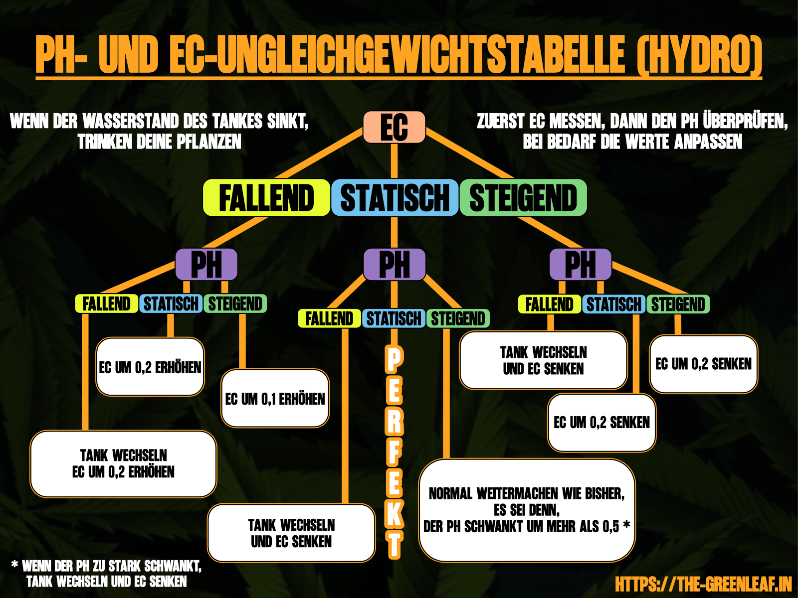 Das Diagramm führt dich Schritt für Schritt durch alle möglichen Szenarien (EC und PH: Fallend, Statisch oder Steigend) und liefert präzise Anweisungen, z.B.: