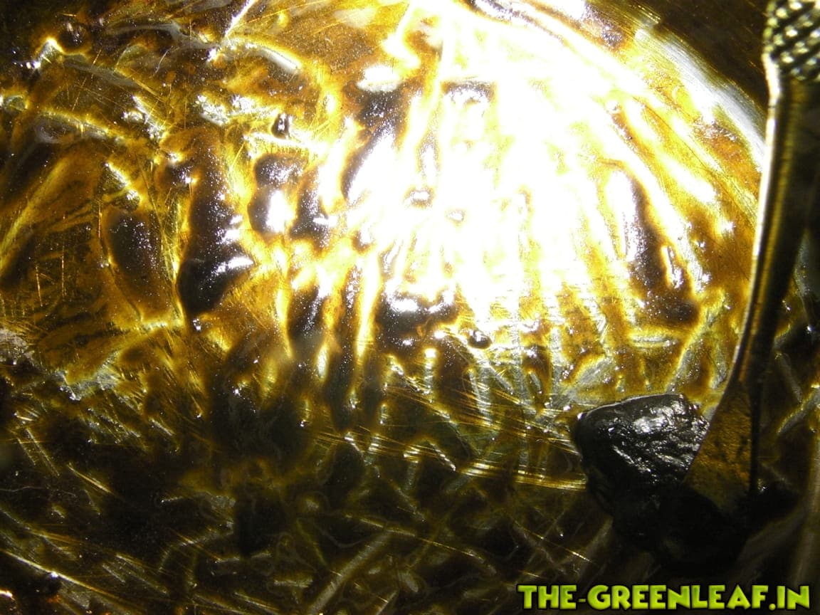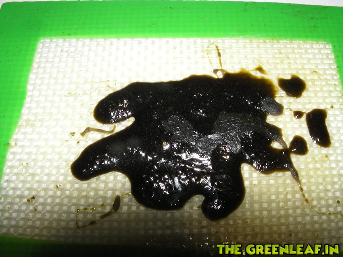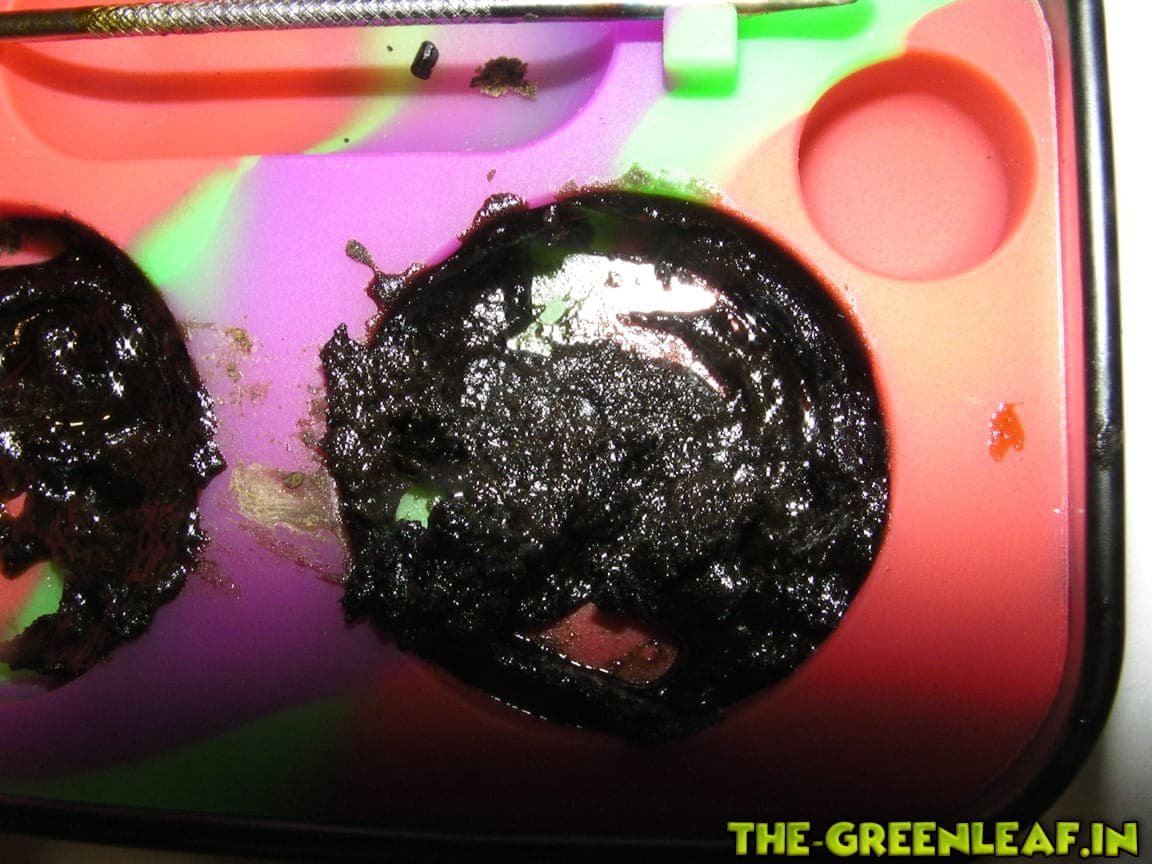ja und nein, zum einen war es durch eine kaffeemühle derbe fein gemahlen zum anderen hab ich in der rohmasse echt alles zusammen geschüttet... polle reste blüten egal, alles in den großen dexso extraktor und in einer großen schale gesammelt... dadurch hatte das schon von vorn herein eine sehr dunkle braun färbung... konsistenz wie baumharz, in gefroren kurz formbar in warm recht flüssig....