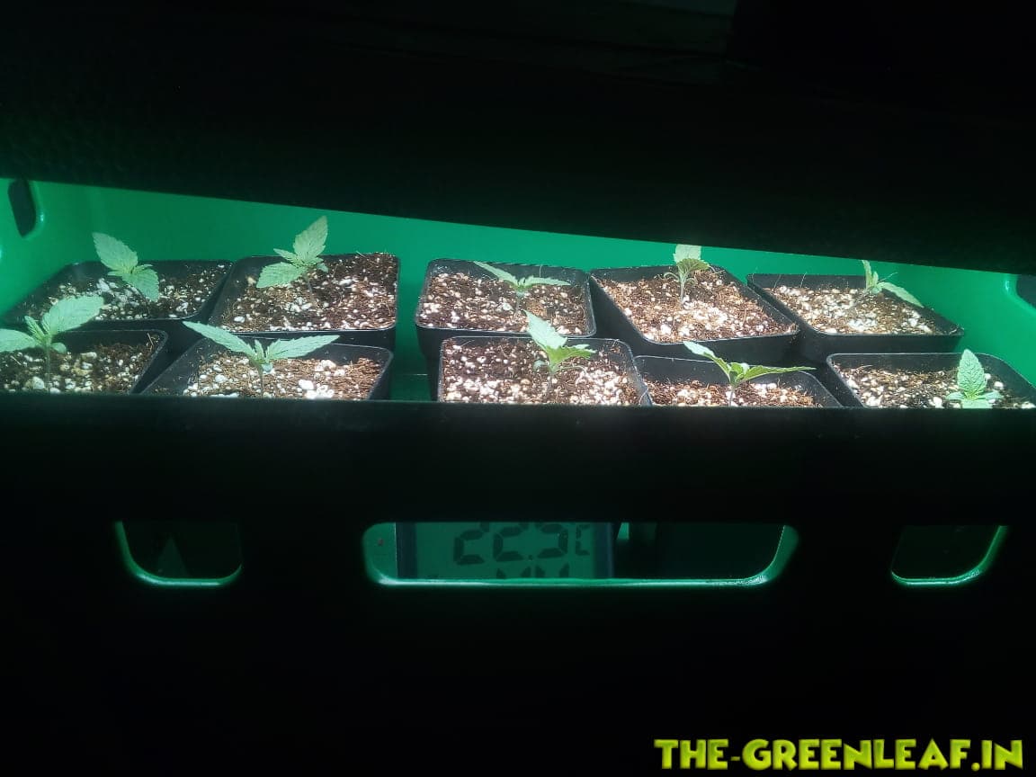 Nun ca 2 Wochen 18/6 unter 2x27W LED, dann schon in 12l Stofftöpfen auf 12/12 unters Frankenstein Panel, für ca 4 Wochen.