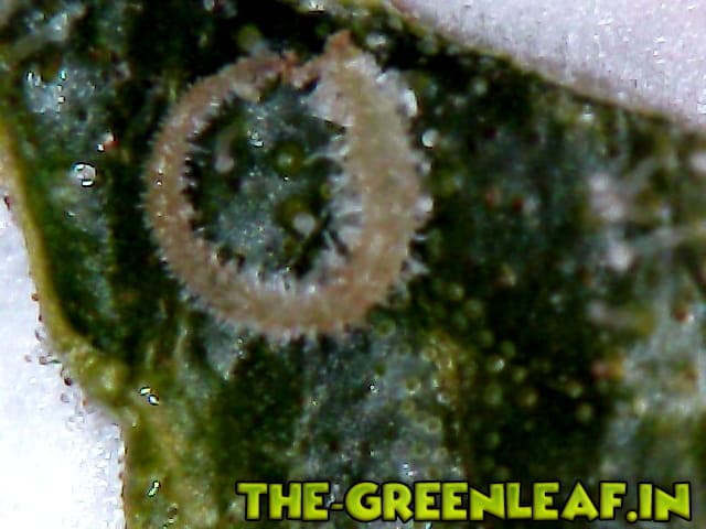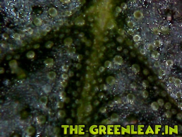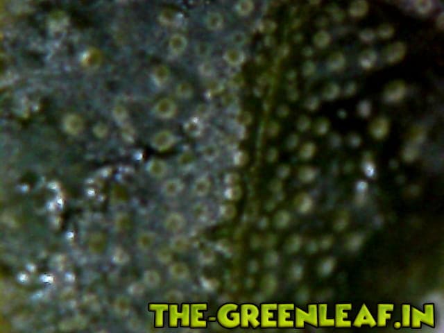 Hier mal paar Bilder von den "Sugar Leaves" direkt von 2 Buds. Da wo viele Trichome sein sollten, sind nur grüne Löcher im Blatt ?(?(