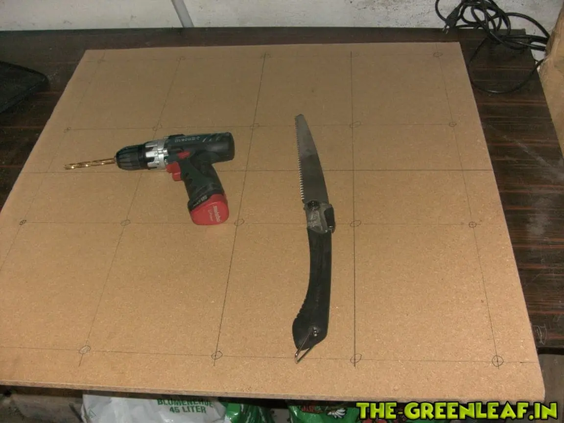 Zuerst habe ich Auf der Sperrholzplatte die Außenmaße eingezeichnet. Anschließend habe ich die Punkte für die Leuchtmittel angezeichnet. Ausgehend von einer zu beleuchtenden Fläche von 1mx1m habe ich mich für ein Maß von 80cmx80xm entschieden und die äußeren Leuchtmittel 5cm vom Rand des Panels nach innen gesetzt. Natürlich war es wie immer wenn ich Basteldrang bekomme. Die Stichsäge ist verliehen und in Benutzung