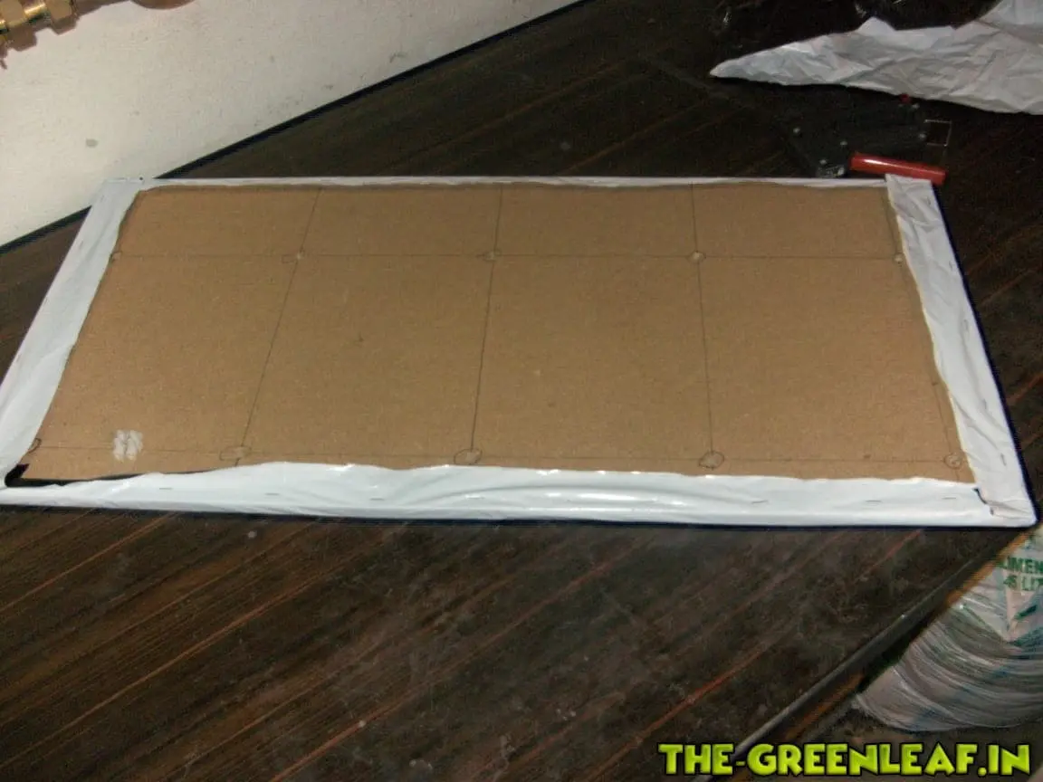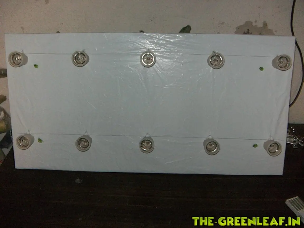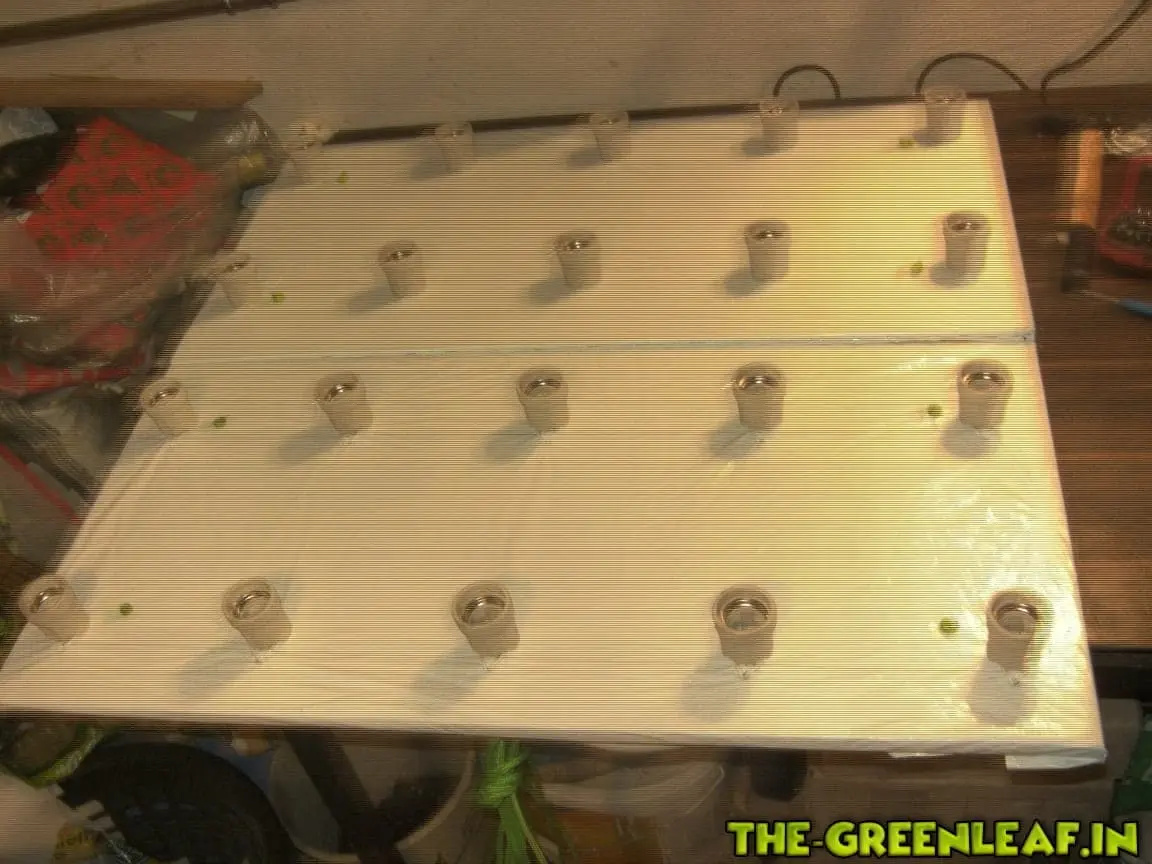 Danach habe ich die 80x80 Platte in der Mitte geteilt. Mit zwei Paneelen ist man einfach deutlich flexibler um unterschiedlichen Höhenwuchs der Pflanzen ausgleichen zu können. Außerdem wurde Schwarz-Weis Folie an der Unterseite der Platte angebracht und mit einem Tacker fixiert.![]()