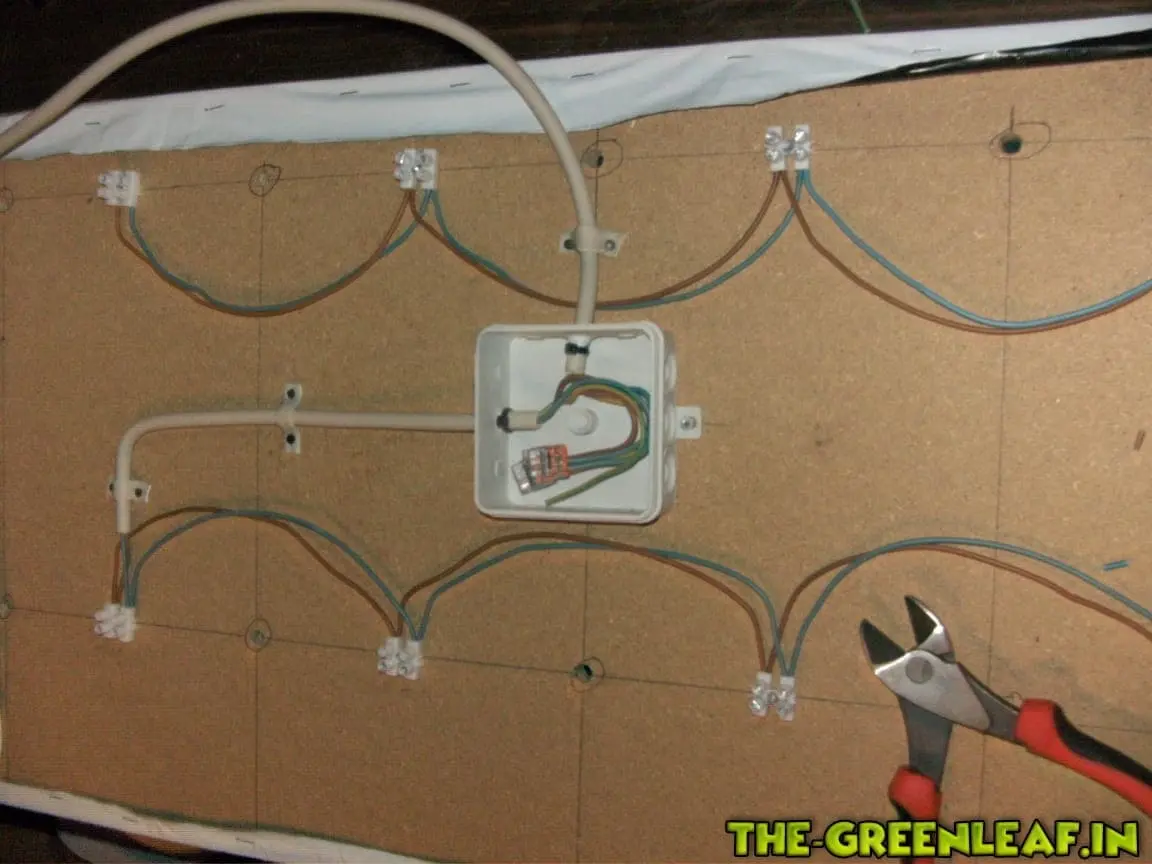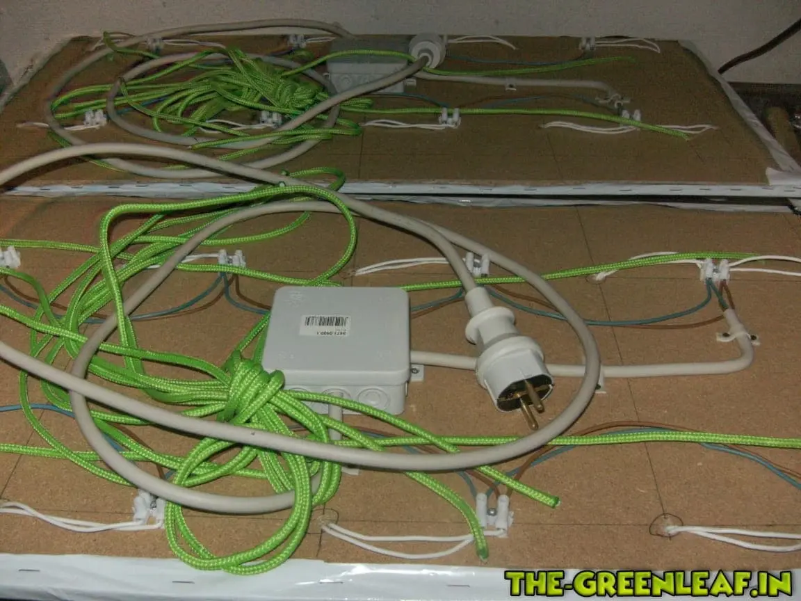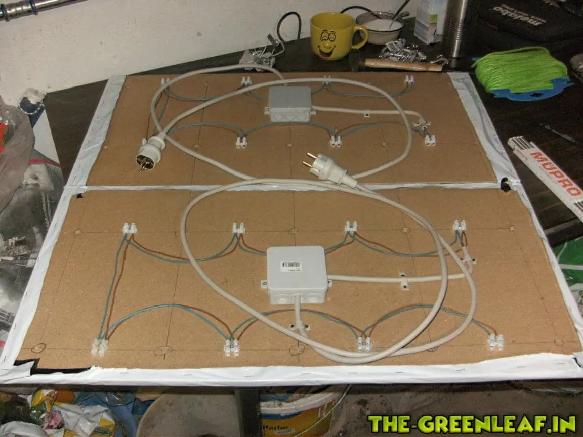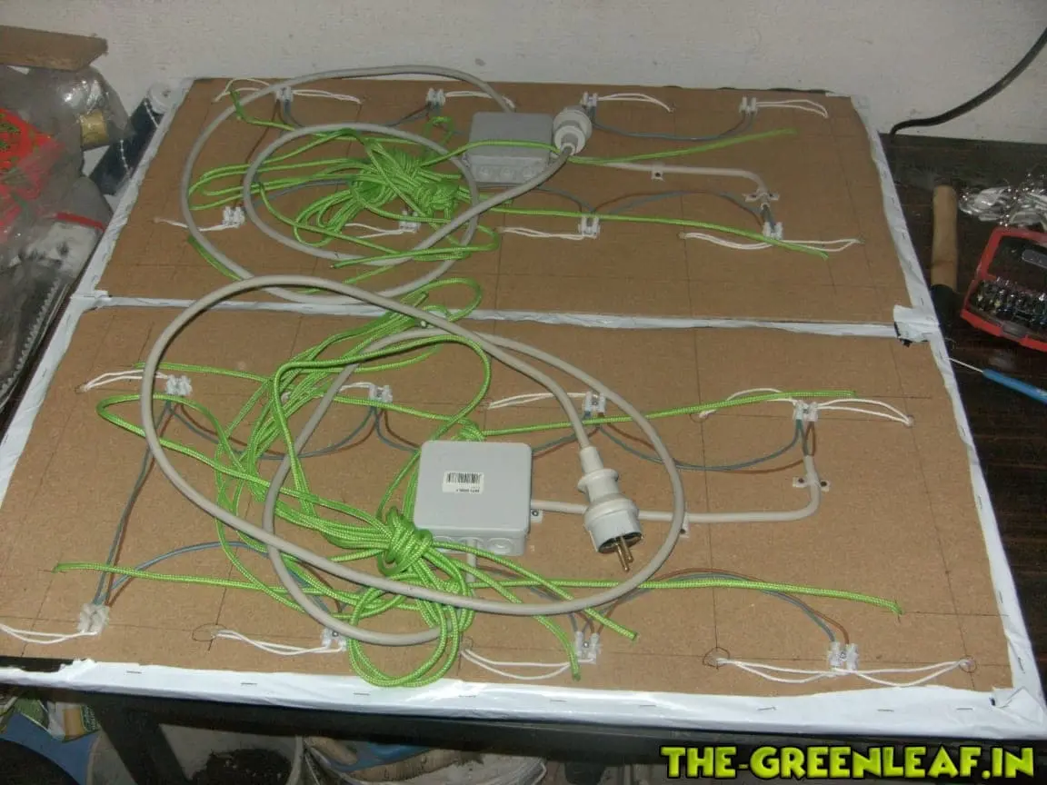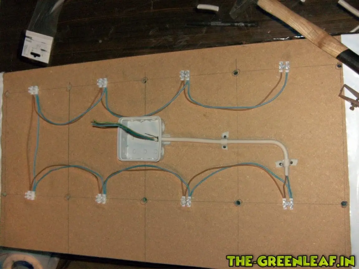 Nachdem nun die Form des ganzen fertig gestellt war, wurde es Zeit die Verdrahtung an zu bringen. Habe mich dazu entschieden jeweils eine Lüsterklemme zwischen zwei Leuchtmittel zu setzen. Diese habe ich mit einer Schraube befestigt und anschließend mit zwei einzelnen 1,5mm² NYM-J Drähten verbunden. In die Mitte jedes Panels habe ich eine Abzweigdose gesetzt. in dieser wird das kabel zum Netzstecker angeschlossen. Sollte ich mal bedarf haben, kann ich einfach beide Paneele darin zusammen laufen lassen und mit einem Netzstecker betreiben.![]()