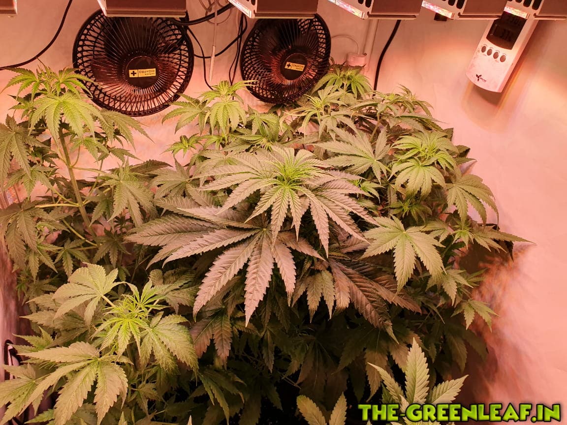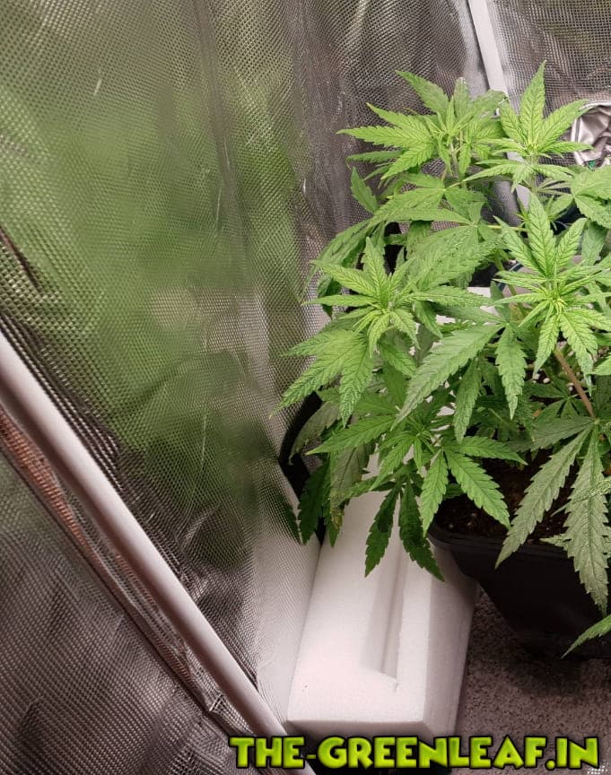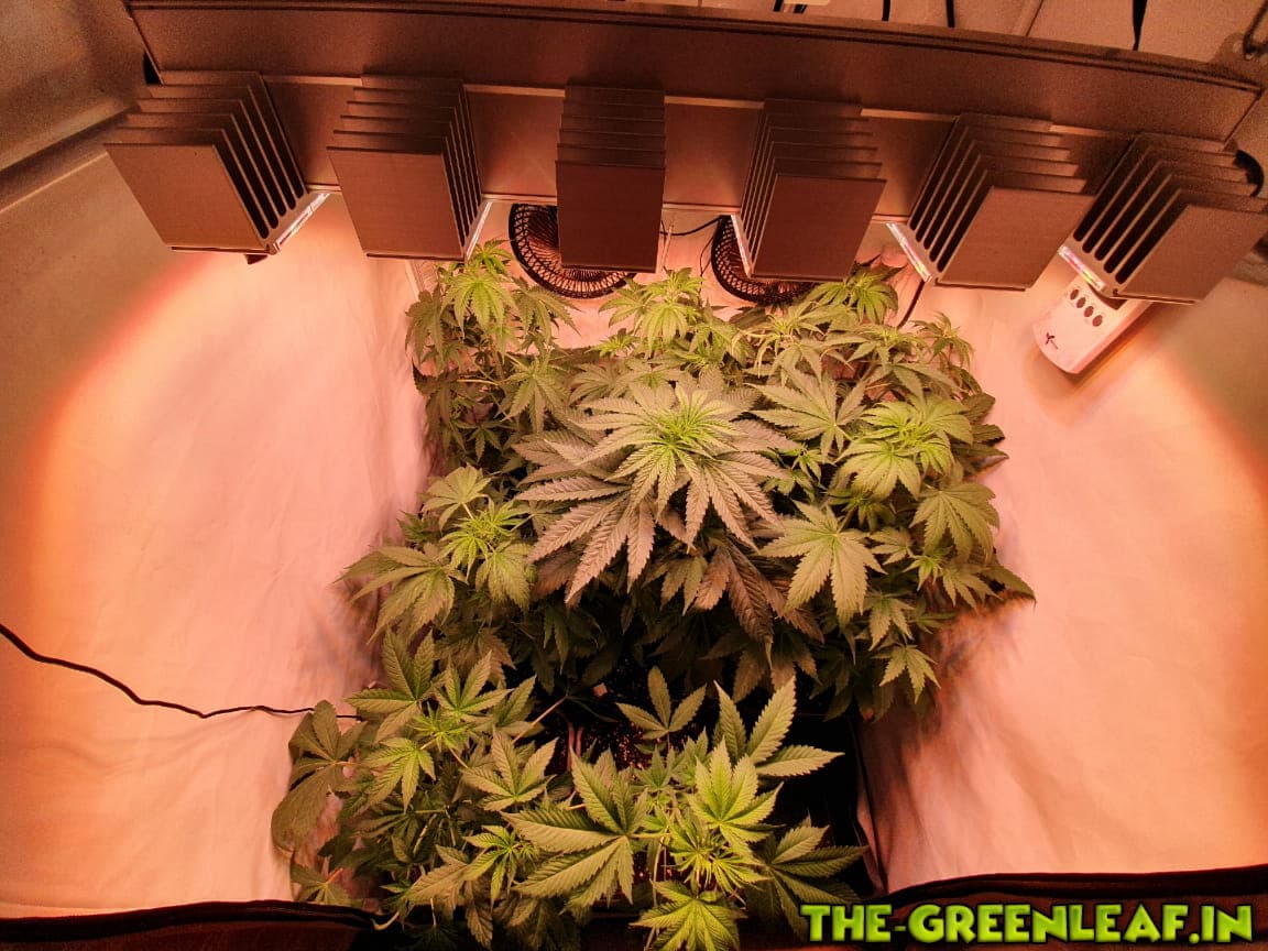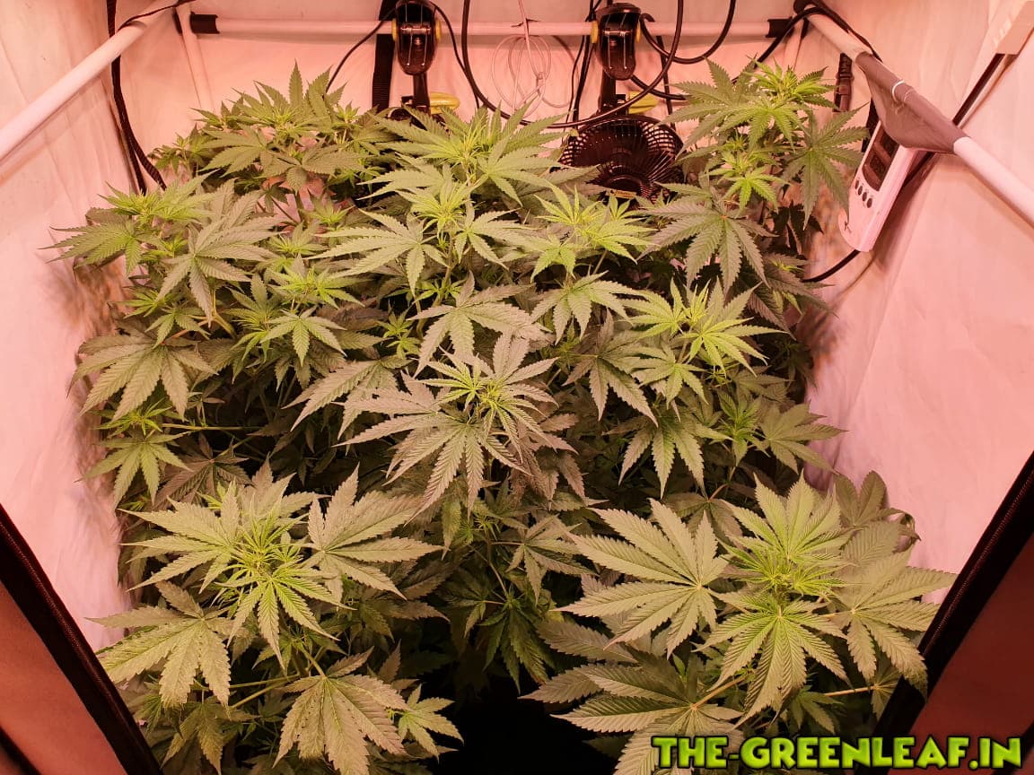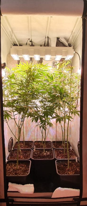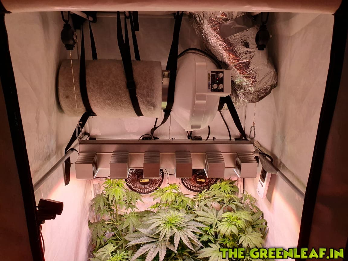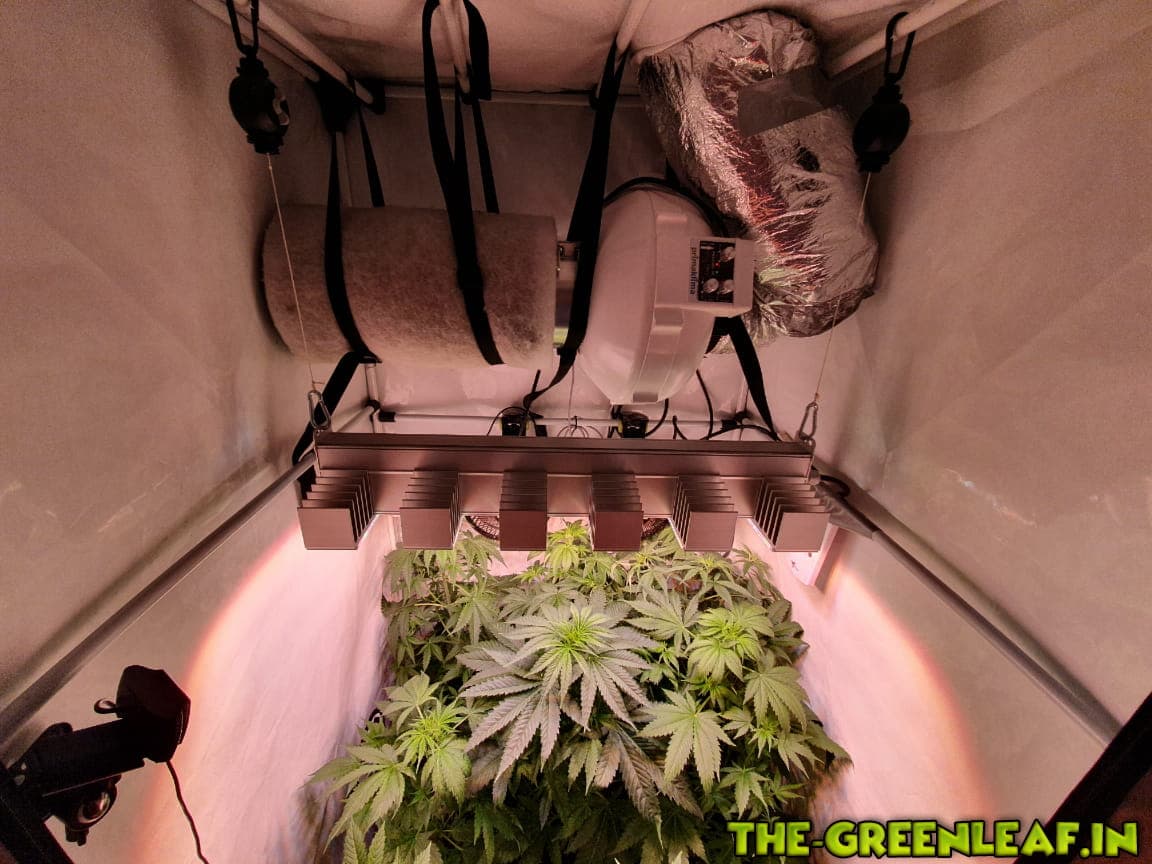 Die Temperatur steigt bis auf 34°C, obwohl die Abluft auf 20% läuft und das Zelt sich eng zusammenzieht.