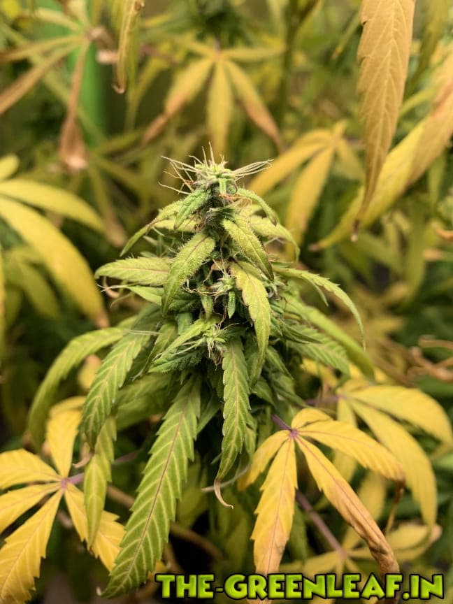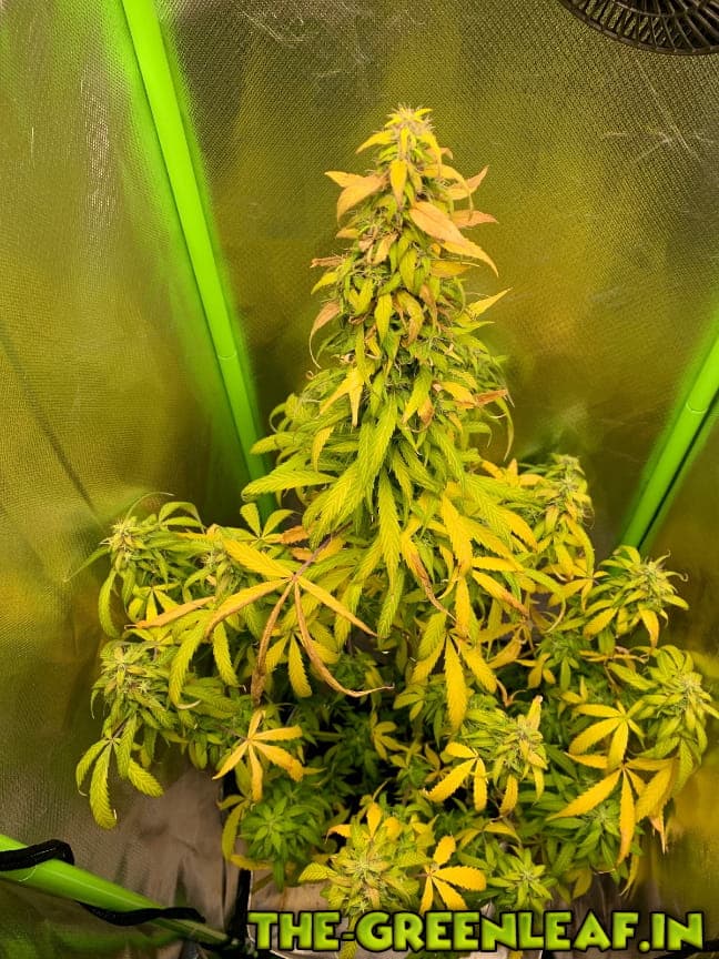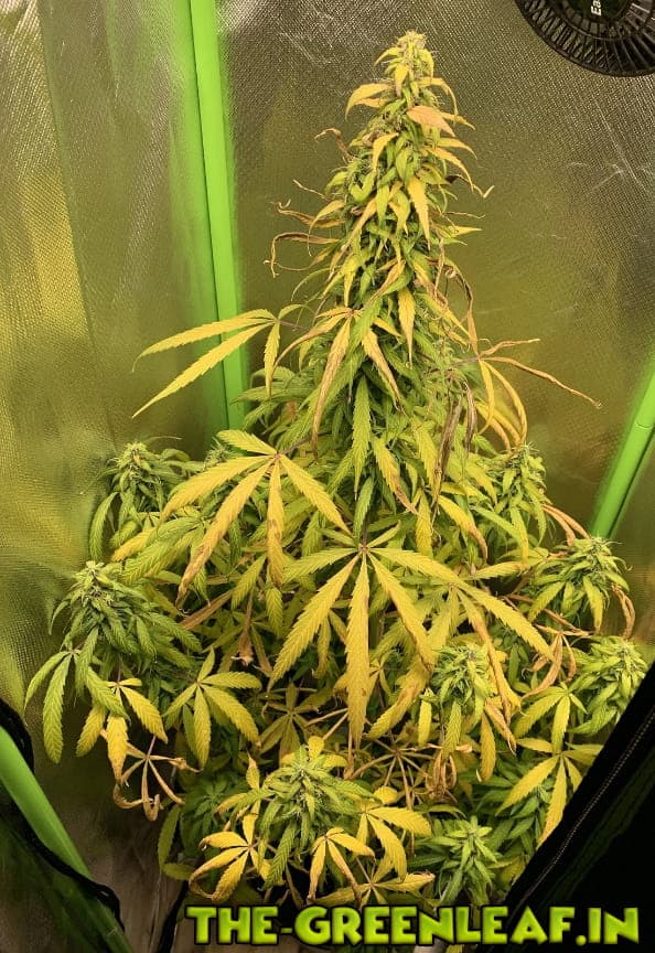 Das sieht mal verdächtig nach ganz deutlichem Düngermangel aus. Die hat sicher ein gutes Stück zu wenig Grow-Dünger gehabt und jetzt alles zusammen gekratzt was da war. Um noch einmal nachzudüngen ist es aber auch zu spät, das verdirbt nur den Geschmack. An sich sollte die jetzt schon gespült werden.