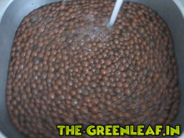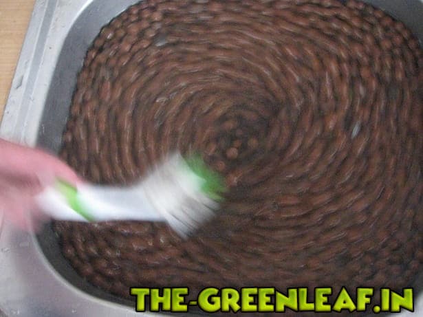 Jetzt lasst ihr heisses Wasser laufen. Fertig! Nun schwimmt alles irgendwann in der Spüle. Wir können nun mit einer alten Spülbürste die Correls im Wasser waschen und sammeln gleichzeitig etwas größere Wurzelfasern mit auf, kleinere Wurzelreste und Schmutzpartikel, sinken alle ab.