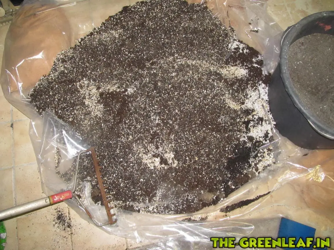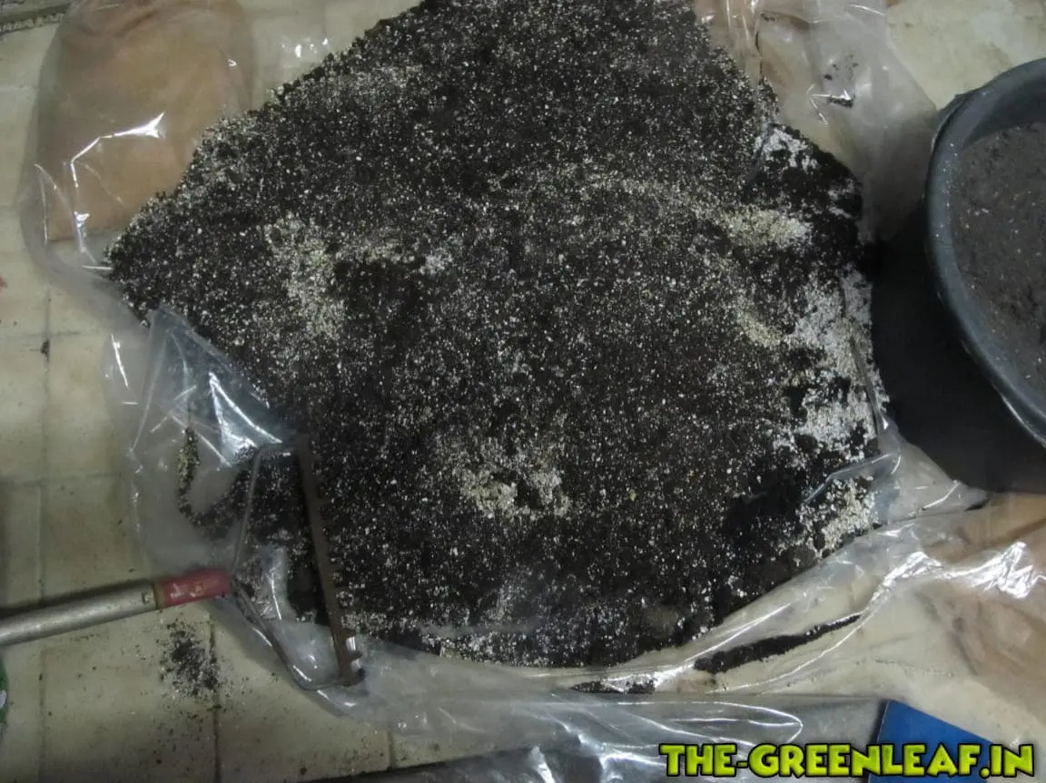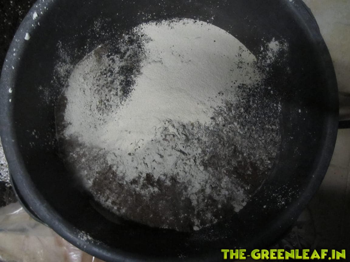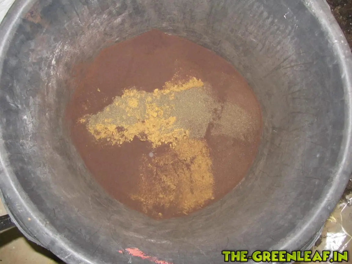 5-10 Liter Pflanzenkohle werden mit 1% Urgesteinsmehl und 1% Zeolithpulver vermischt.