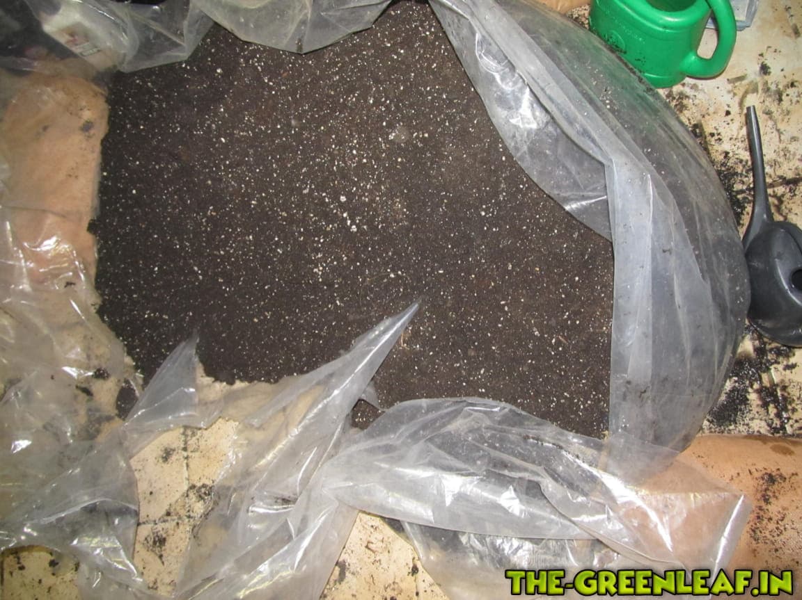 Diese Mischung wird mit Osmosewasser, das 3% Melasse und 3% EM-aktiv enthält gleichmässig befeuchtet.