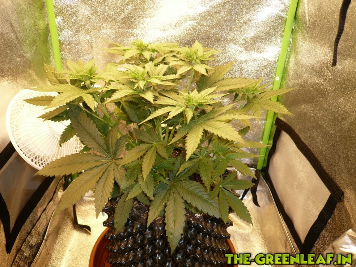 Leider habe ich von den ersten 21 Tagen keine Bilder. Die junge Dame steht im 60x60x140 Zelt (seit drei Tagen), wird von zwei China Lampen (zusammen 34 Watt) und einer GrowKing Rail 40+ mit Licht (18/6) versorgt.