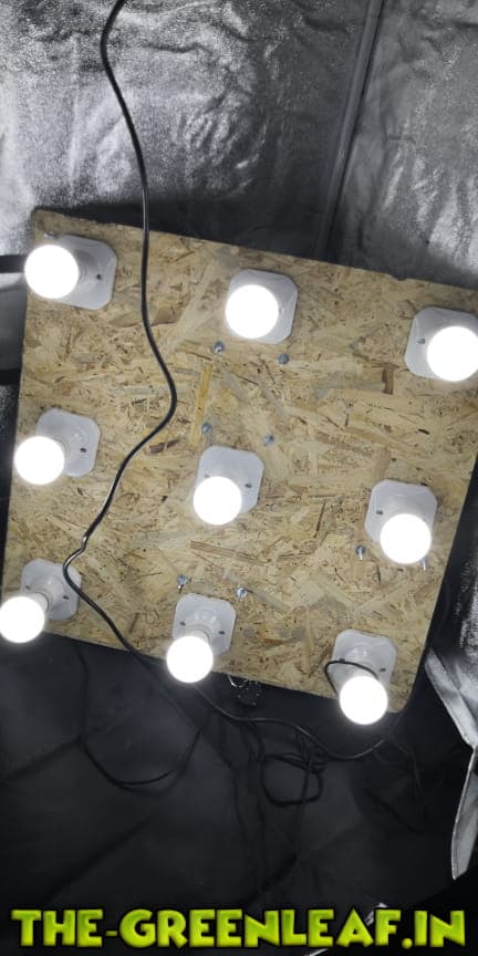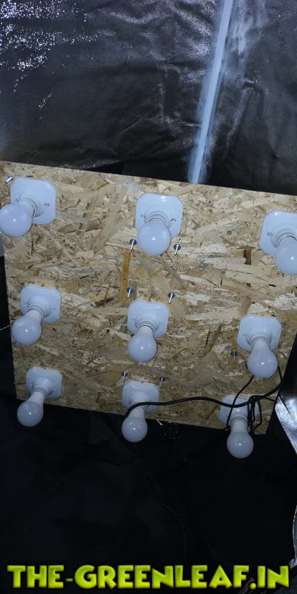 Als Beleuchtung habe ich mir ein Panel aus 9 E27 Fassungen gebaut, für die Vegi mit 13Watt 1521 Lumen 6500K von Osram und für die Blüte mit 20Watt 2452 Lumen 2700K ebenfalls von Osram bestückt.