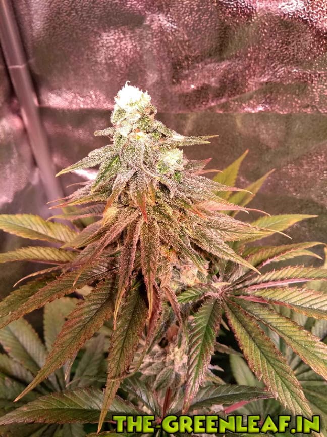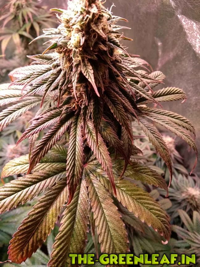 Bild 1: Die Stengel dieser Pflanze sind matschig. Wenn ich Bläter entferne, dann knacken die nicht zwischen den Fingern, sondern naja. Matschen halt. Außerdem hat der Bud irgendwie keine Härchen und sieht verkrüppelt aus neben Lilafärbung der Blätter und der Stamm durchzieht sich auch langsam mit lila Streifen.