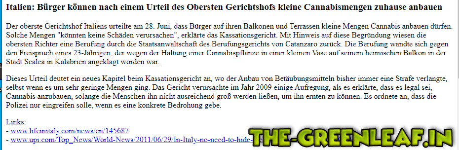 Irgendwo hab ich mal mitbekommen dass Italien 200 Joints im Jahr unter Eigenbedarf zählt und 3 Joints auf 1 Gramm Gras oder 5 auf 1 Gramm Dope rechnet. Damit sind die bei 66 Gramm durchschnittliches Gras oder 40 Gramm Hasch. Eine Anlage mit 3 Ernten im Jahr darf nach dem Urteil also eine mickrige Pflanze haben. Sonst gilt es ausdrücklich nicht.