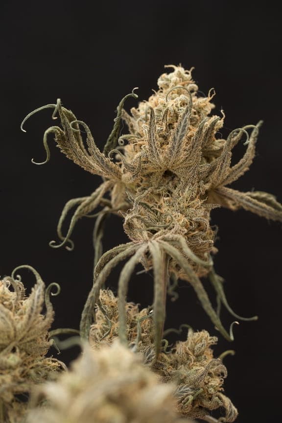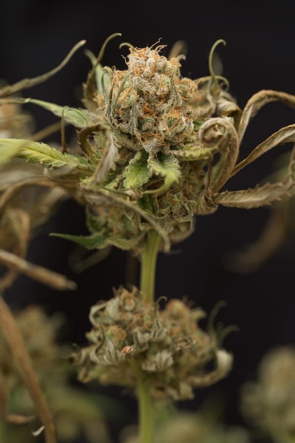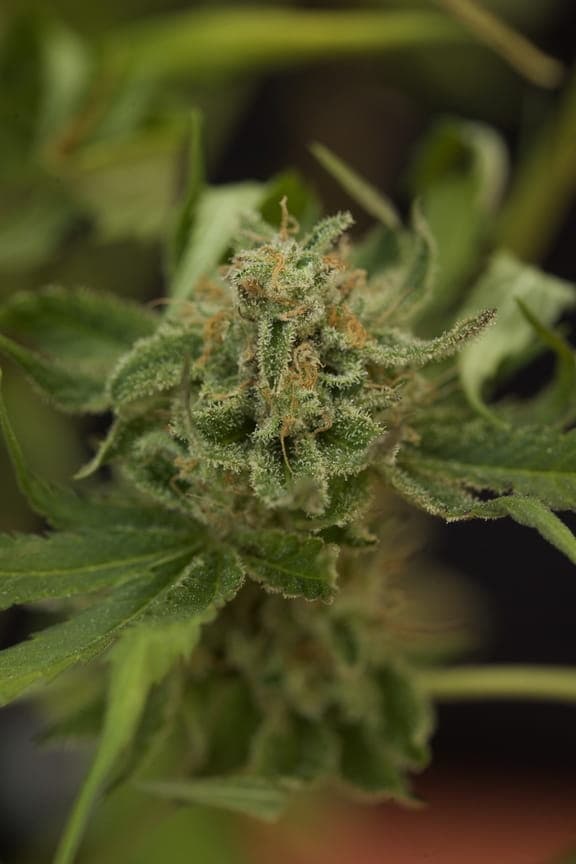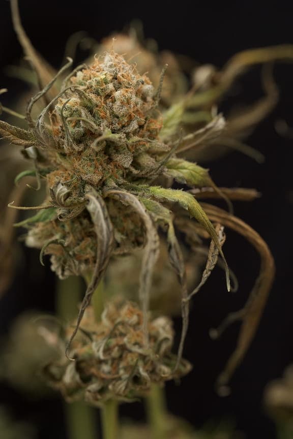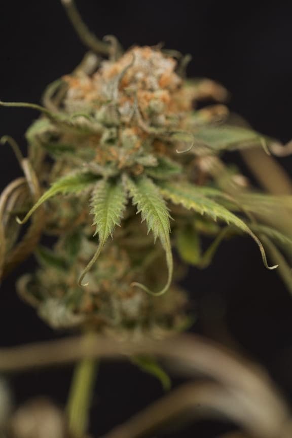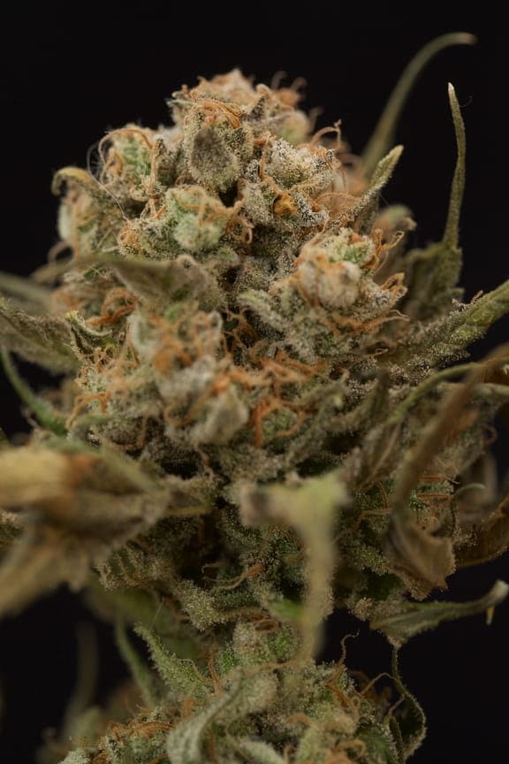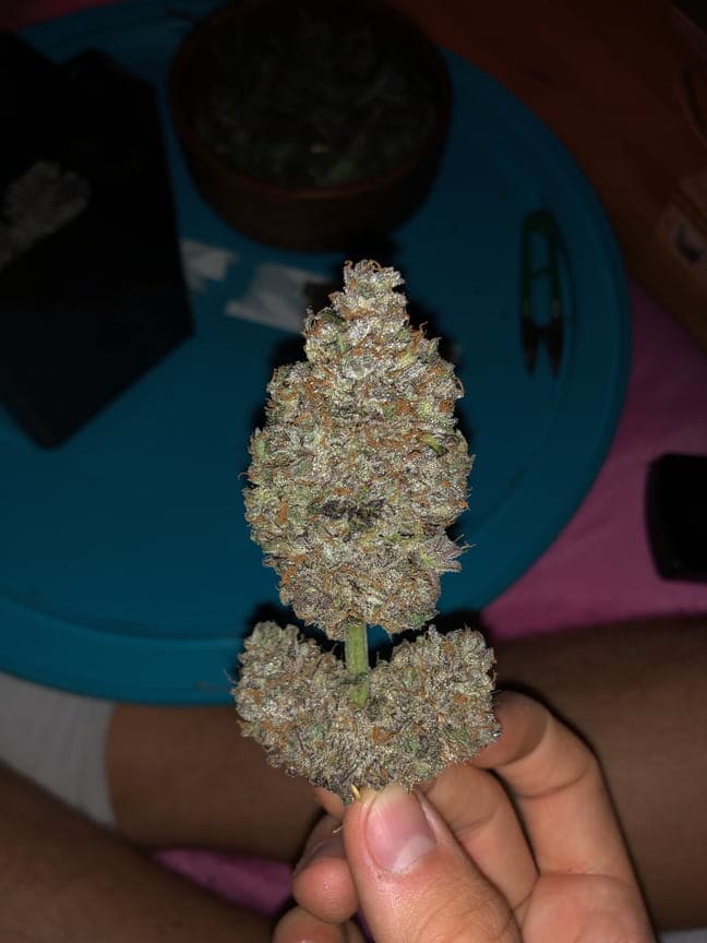 Ihre pistils sind ein normales Braun/orange und die Blüten haben eine rundliche Hybrid-Form. Sie sind schon ordentlich mit Harz überzogen, aber von den restlichen Farben eher lasch; ein dunkles grün bis braun.