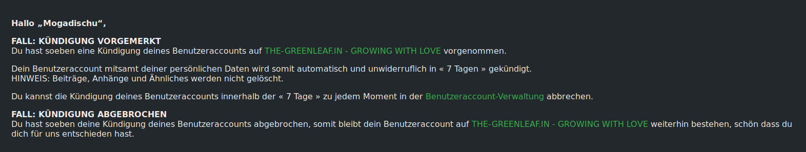 Es ist absofort jedem User (außer Team-Mitglieder) selbst überlassen sein Benutzeraccount selbstständig in der Account-Verwaltung zu kündigen, nach Bestätigung der Kündigung wird das Benutzeraccount nach 7 Tagen automatisch gelöscht (Hinweis: Beiträge, Anhänge und Ähnliches werden nicht gelöscht).