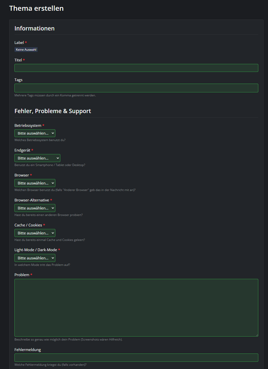• Ein Themenformular für Fehler, Probleme & Support wurde eingerichtet (das hilft ungemein bei der Fehleranalyse).