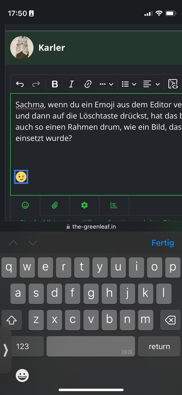 Sachma, wenn du ein Emoji aus dem Editor verwendest und dann auf die Löschtaste drückst, hat das bei dir dann auch so einen Rahmen drum, wie ein Bild, das per c&p einsetzt wurde?