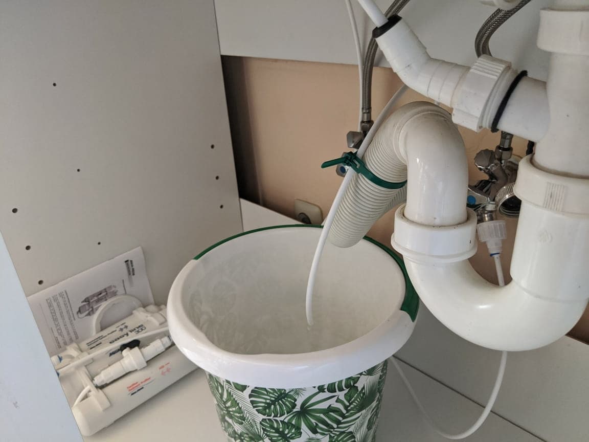 A: Den Schlauch führt man in die Spüle oder in einen Tank zum Blumengießen
