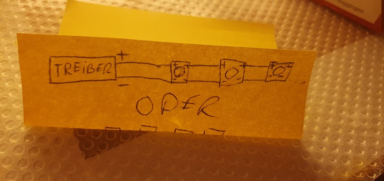 Also vom Netzteil + auf Led + und dann von Led + auf LED + dann von Led + auf Led + usw