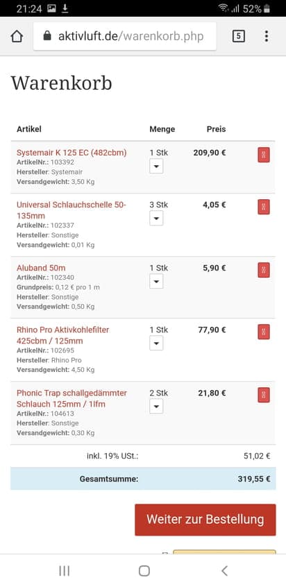 Einen größeren Lüfter nehme ich nicht, da unklar ist ob und wann ich mal ein größeres Zelt kaufe. Sollte ich doch der nächstgelegenen Hippie-Kommune nach meinem Umzug Ende des Jahres beitreten, wird halt alles nochmal gekauft und durch die Anzahl der Hippies geteilt. ☝️?