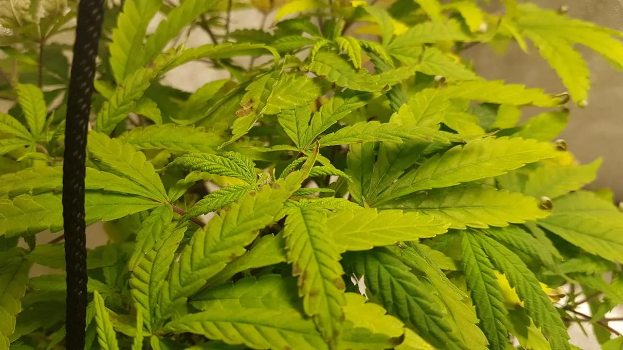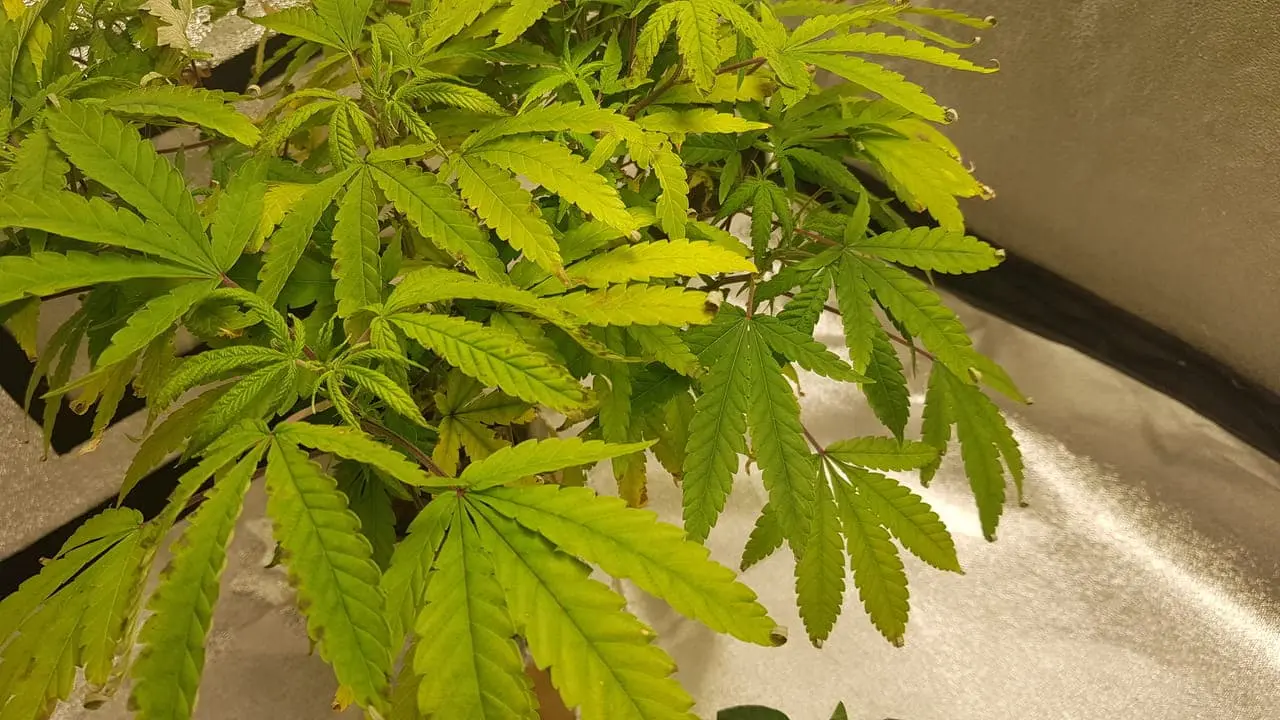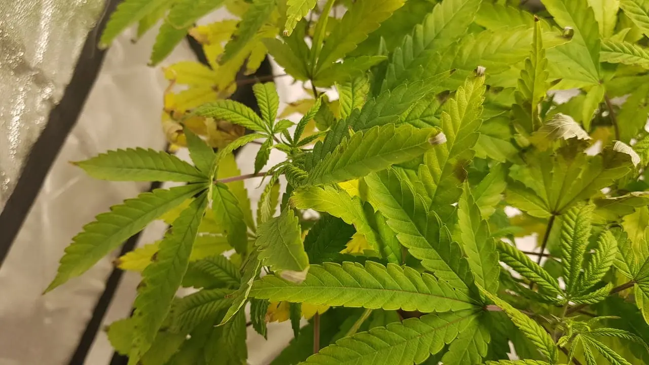Kleines Problem. Dunkle Flecken auf den Blättern von Green Gelato. Kaliummangel und Kalziummangel wegen zu viel Mg vielleicht? Die White Widow sieht ok aus. (3. Foto)