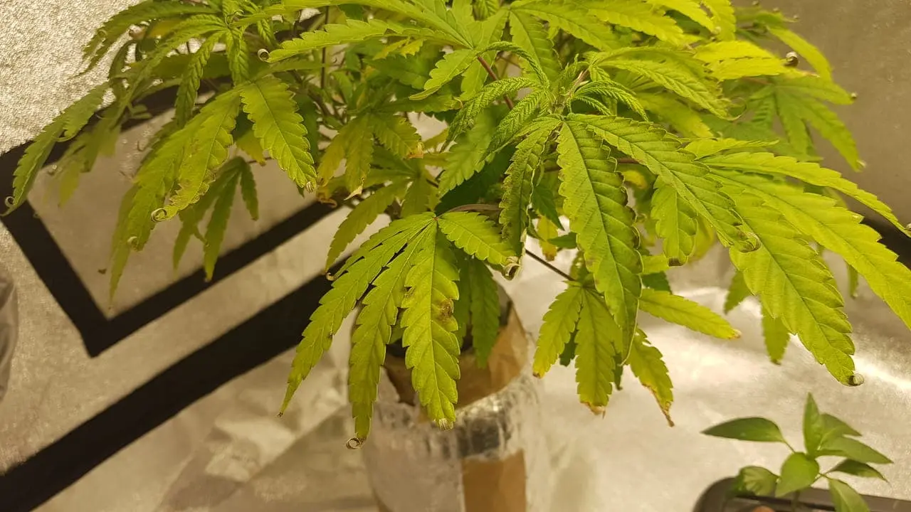 - Die große Pflanze zeigt Probleme. Ich habe vorgestern eine frische Nährlösung hergestellt, anstatt nur Wasser zu gießen (wegen der hohen EC, die sich immer erhöhte bis um 1,9mS. Aber sie zeigt keine Besserung.