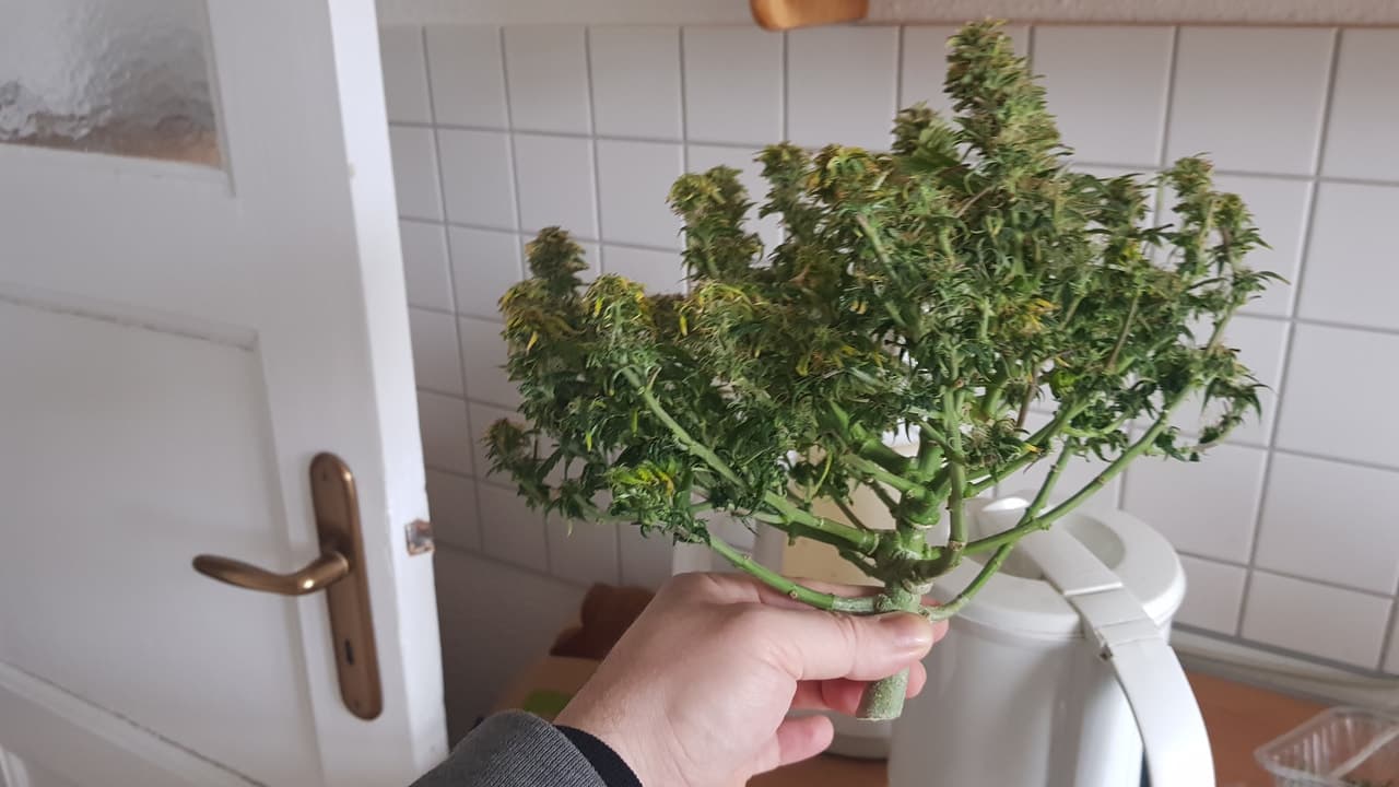 Der erste Schnittt vom Green Gelato ist genommen. Die Hauptbud (17g) ist zu 70% abgeerntet, zum Trocknen in 2 Papiertüten vom discounter in der Growbox über dem Licht aufgehangen. Der Rest kommt morgen oder übermorgen ran.