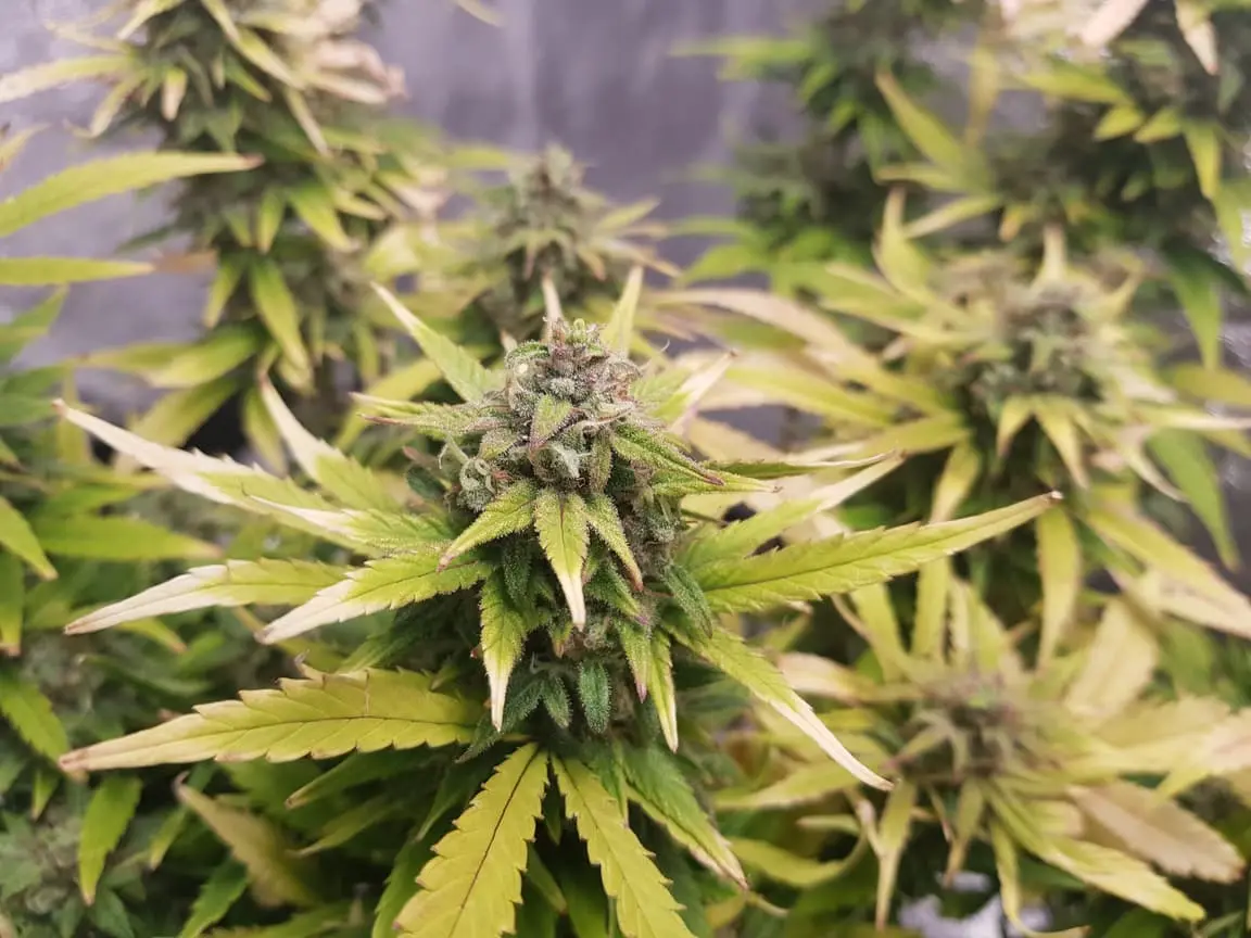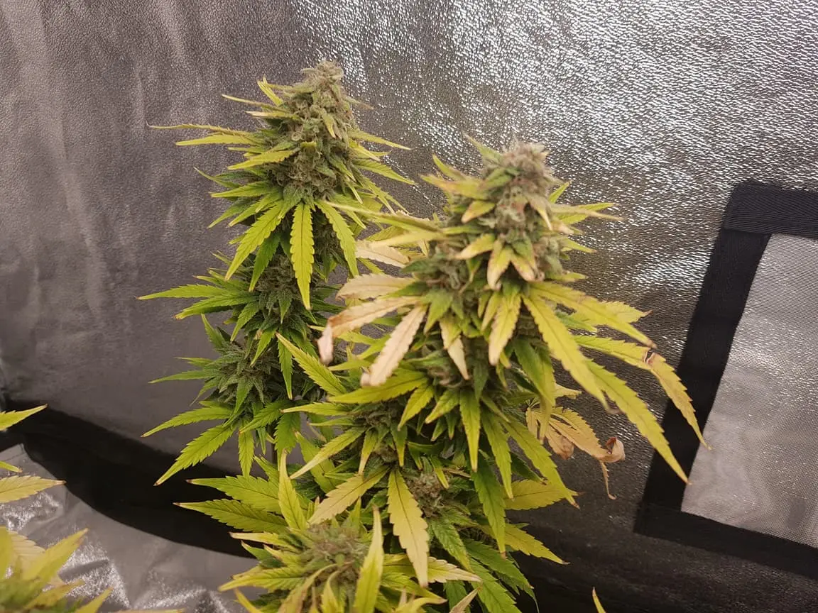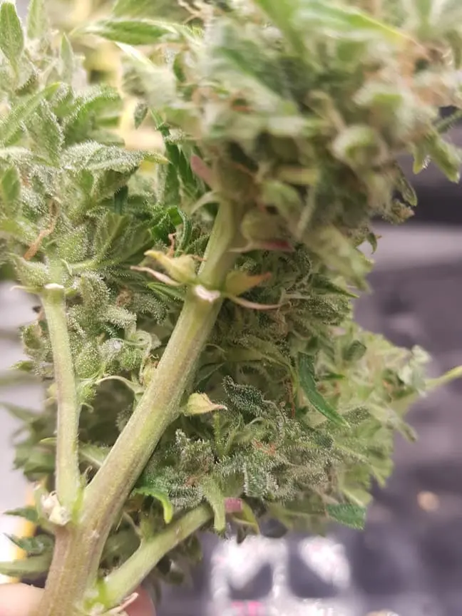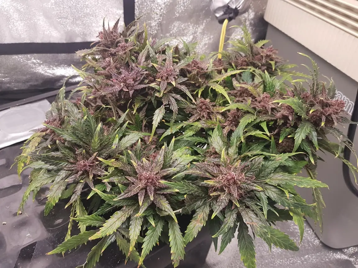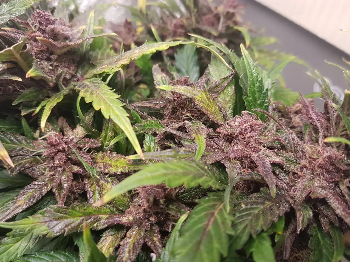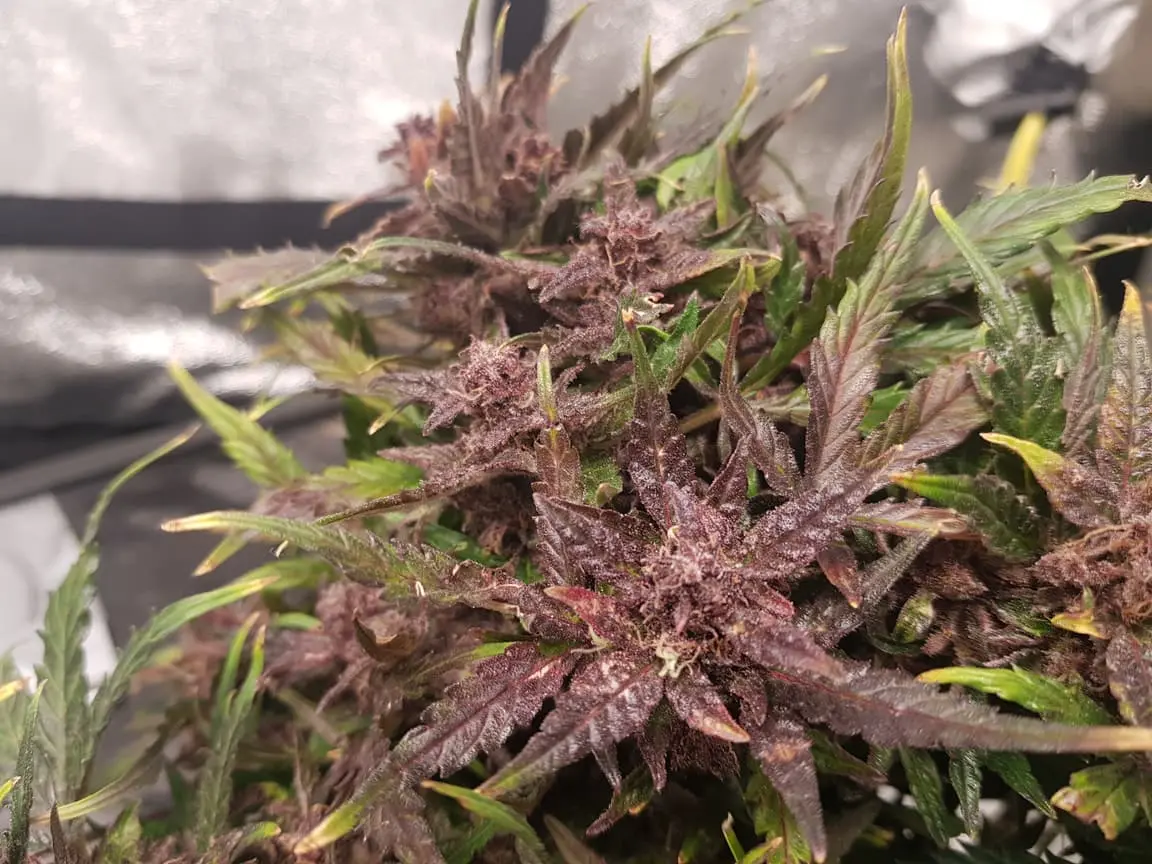 Die hatte nur Purpur Buds. Die Blätter waren bis vor dem Flush noch alle dunkelgrün. die Blätter fingen erst dann die Farbe zu wechseln, nachdem ich angefangen hab zu flushen. Währen die AK-420 weiche Blätter hatte hat die Purple Queen feste/harte Blätter.