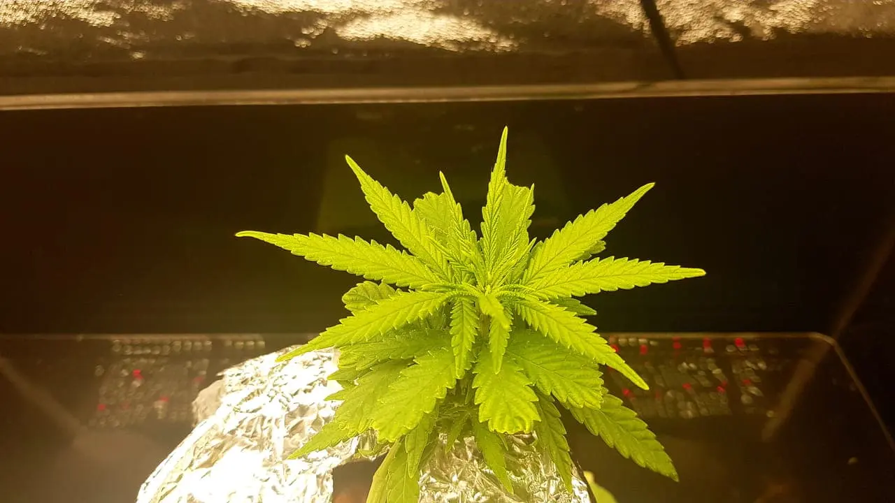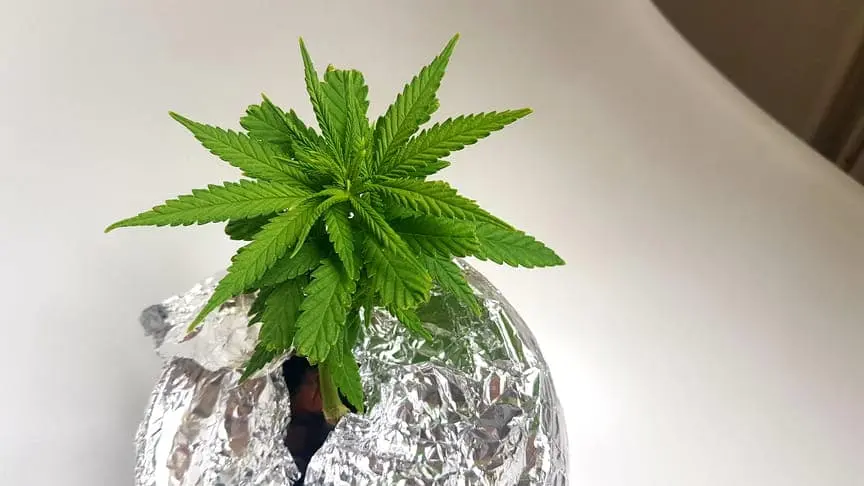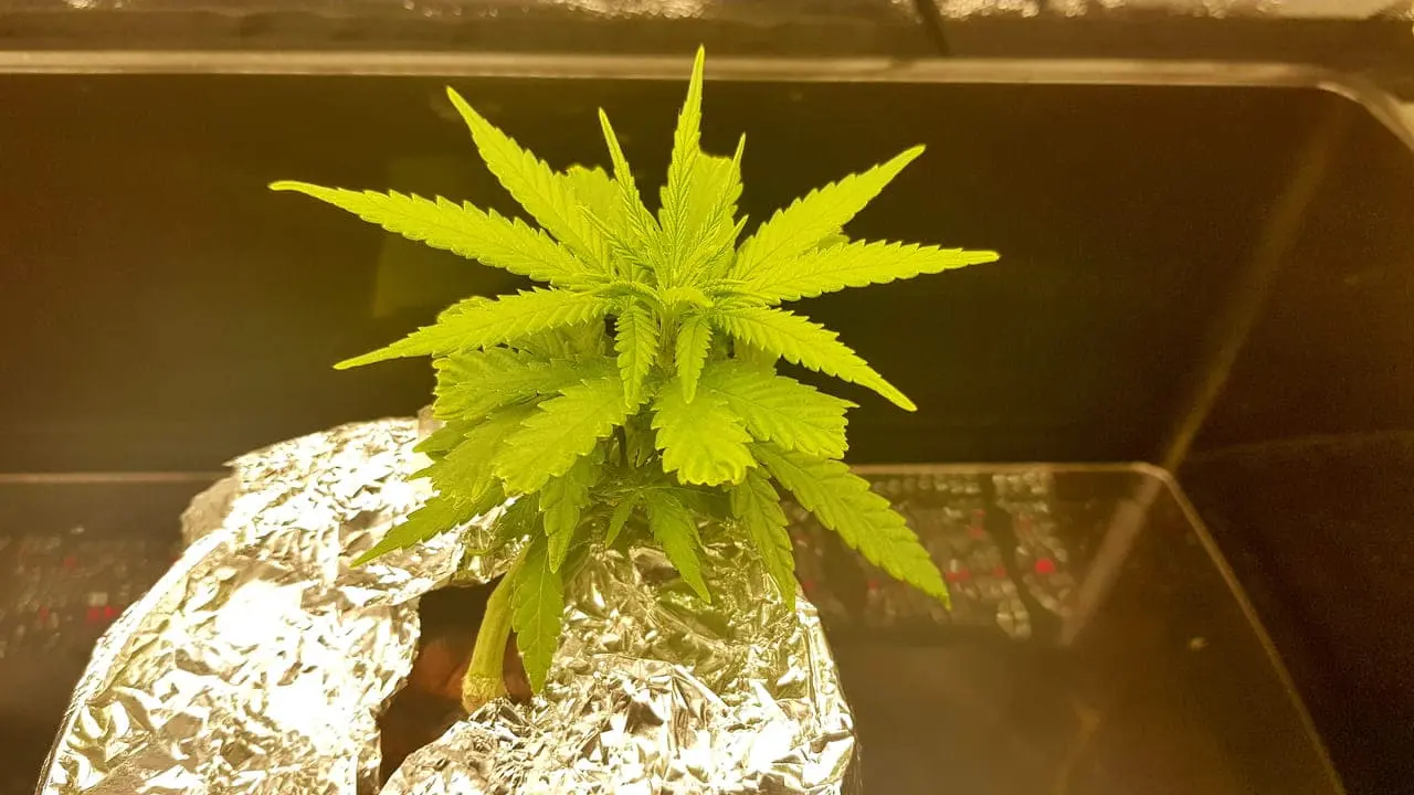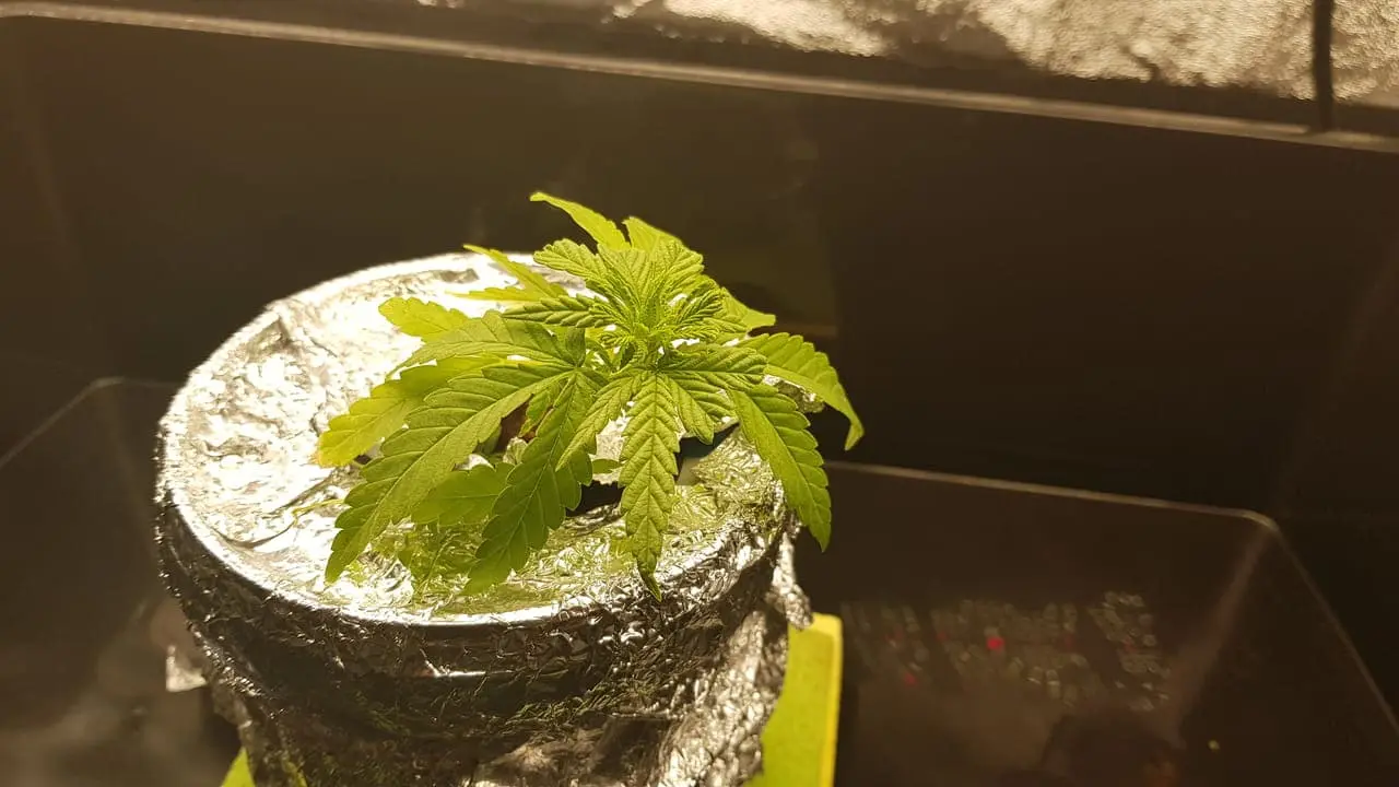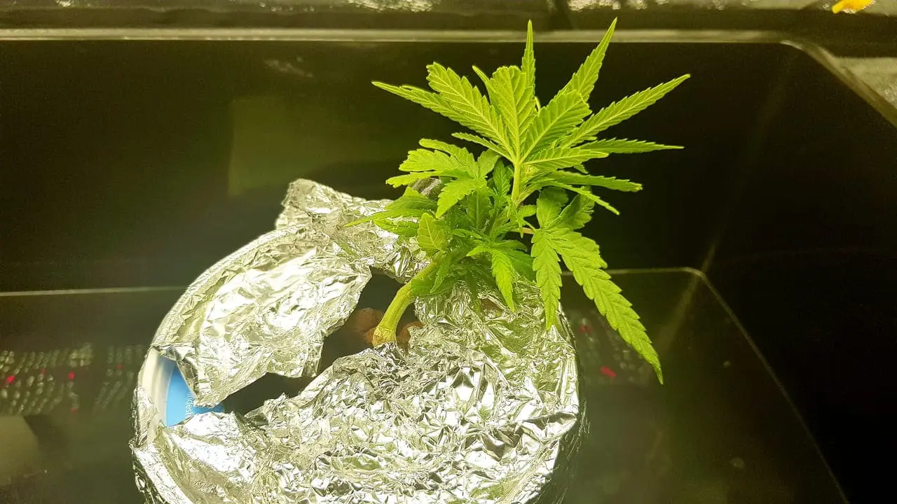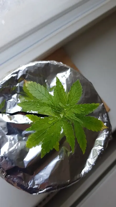 Leider ist mir die Wurzel, zu 3/4 abgebrochen, aber ich wollte sie trotzdem nicht aufgeben. Nun ist die Pflanze Einen Monat alt aber halt Bonsai denke ich. Bis gestern war alles ok, jedoch innerhalb von ein paar Stunden sind die Blätter gelb geworden und heute morgen sahs dann so aus. In so einem Mini-Yoghurteimer-Setup an der Fensterbank hat sich die Temperatur selbständig gemacht, und ich maß 32 Grad Celsius. Kein Wunder: Nutrition lockup vermute ich. Habe den Eimer jetzt mit Alufolie umwickel um das Licht wegzureflektieren. Viel wird es nicht bringen denke ich, bei Aussentemperaturen von über 38 Grad. Die Wohnung ist auch 28 Grad :/. Ich denke mal eine Klimaanlage im Sommer ist ein Muss fürs Growen. Wasserchiller evtl. auch. -