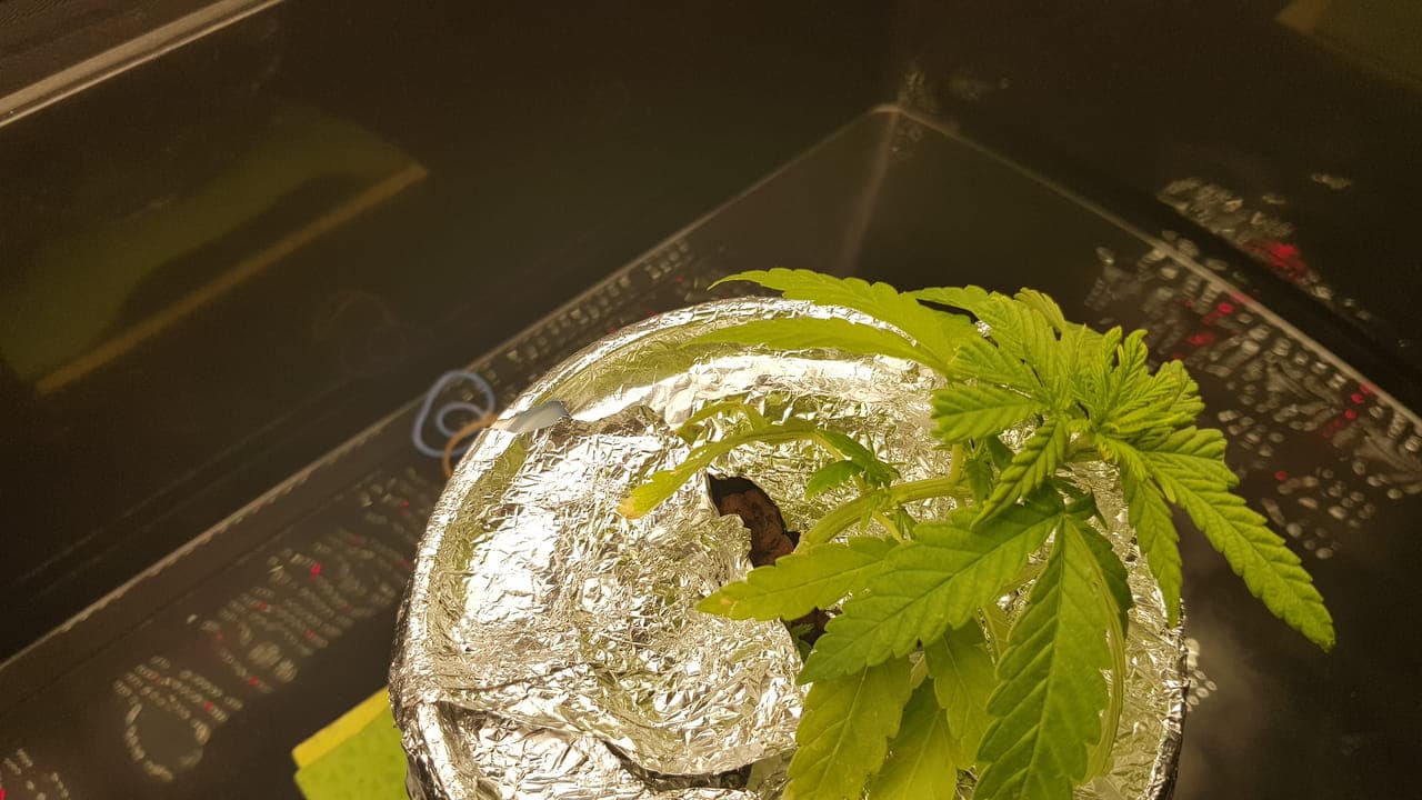 Leider ist mir die Wurzel, zu 3/4 abgebrochen, aber ich wollte sie trotzdem nicht aufgeben. Nun ist die Pflanze Einen Monat alt aber halt Bonsai denke ich. Bis gestern war alles ok, jedoch innerhalb von ein paar Stunden sind die Blätter gelb geworden und heute morgen sahs dann so aus. In so einem Mini-Yoghurteimer-Setup an der Fensterbank hat sich die Temperatur selbständig gemacht, und ich maß 32 Grad Celsius. Kein Wunder: Nutrition lockup vermute ich. Habe den Eimer jetzt mit Alufolie umwickel um das Licht wegzureflektieren. Viel wird es nicht bringen denke ich, bei Aussentemperaturen von über 38 Grad. Die Wohnung ist auch 28 Grad :/. Ich denke mal eine Klimaanlage im Sommer ist ein Muss fürs Growen. Wasserchiller evtl. auch. -
