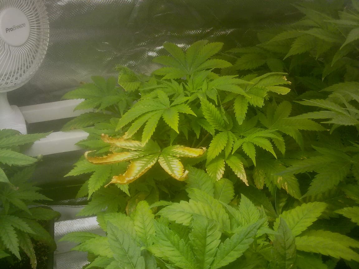 also erstmal ganz klar sieht man immernoch den Magnesiummangel. (starke aufhellung zwischen Blattadern im mittelsegment der pflanze und verlust vom Grünton)