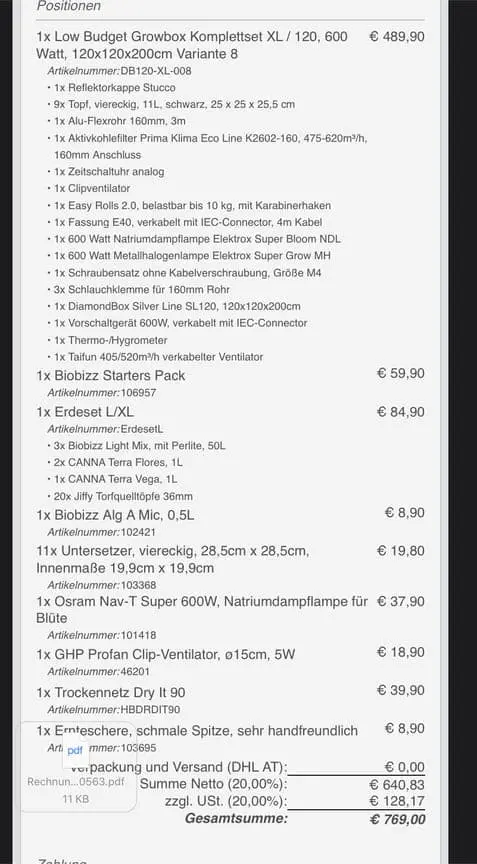 Im Anhang sehr ihr keine Rechnung für das komplettset. Ich denke ich habe alles was für meinen ersten Grow benötigt wird (außer die Stecklinge).