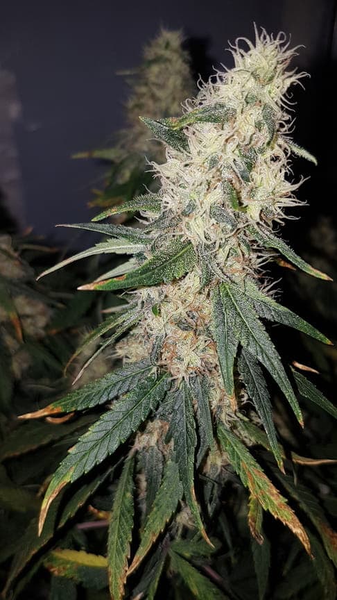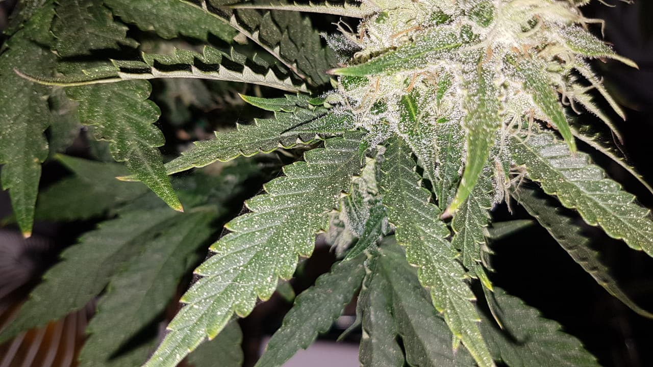 Immer noch der geringste Spinnmilbenbefall hier zu sehen, ist aber nur noch eine Frage der Zeit. Bis auf die Nekrosen gefällt sie mir gut. Wird immer fetter und sieht einfach toll aus. Der Sativa Phenotyp kommt richtig gut raus.