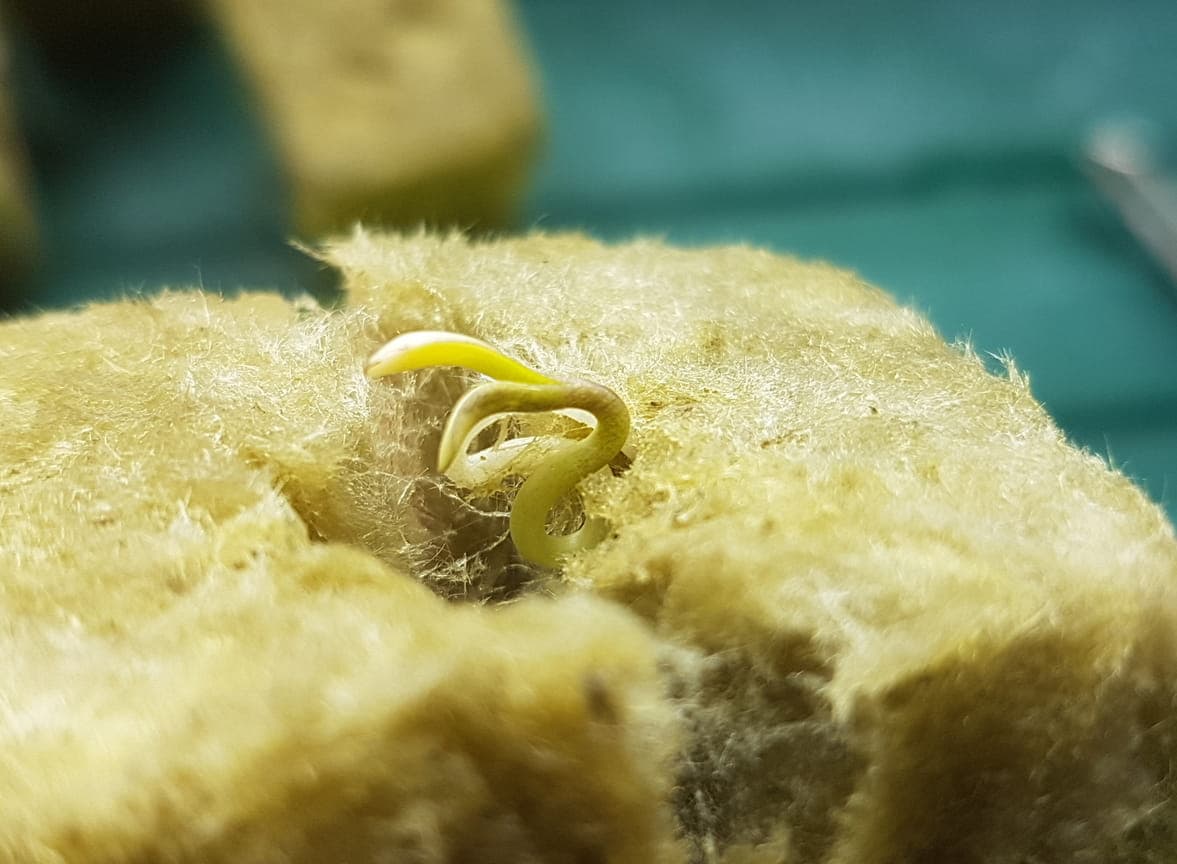 Die ersten zwei Samen sind jetzt aus den Steinwolleblöcken "geschlüpft". Allerdings sieht bei einem die Wurzel extrem ungewöhnlich aus.