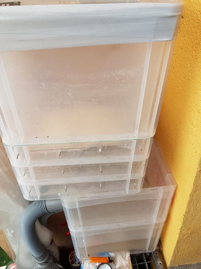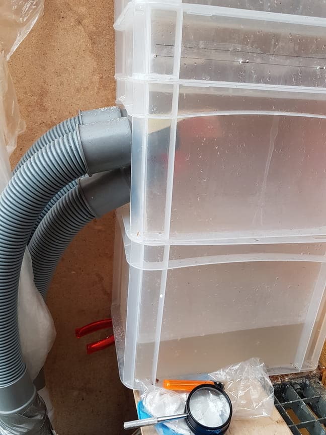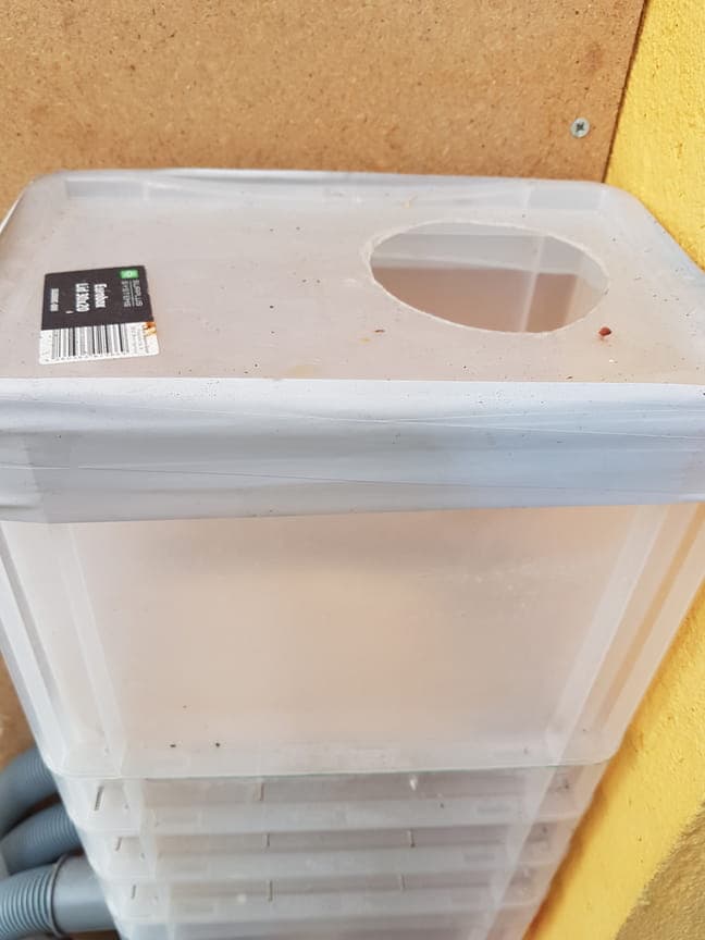 Die oberste, hohe Box, hat bei mir keinen Boden damit die Luft direkt auf das Granulat gesogen wird. Dann verschließt du mit dem passenden Deckel der mit einem großem Lufteinlas zu fersehen ist. In meinem Fall 150mm rund und passend für das Flexrohr.