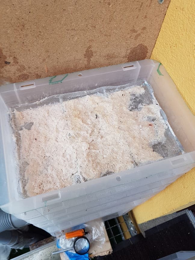 Bild xx413 und xx404 zeigen die flachen Boxen. Auf dem Bild xx413 siehst du das seitlich so "pinne" rauskucken. Das sind stabile Drähte ( Schaschlickspieße o. Ä.) die durch die Box gehen. Daran habe ich das Fliegengitter befestigt in dem ich es auf die Drähte aufgezogen habe. Das weiße auf dem Fliegengitter ist das Granulat.