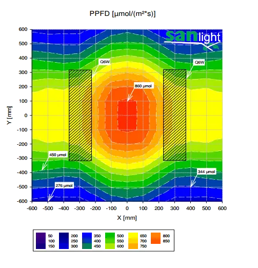 auf 2xSanlights 120x120cm (1,44m2) 530 µmol/m²s530 µmol/m²s und Einzeln auf 80x80