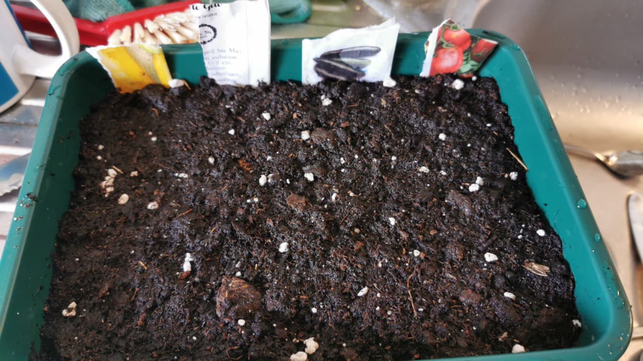 Das neue Gewächshaus wurde aufgebaut und die Gemüse Samen sind in der Erde.