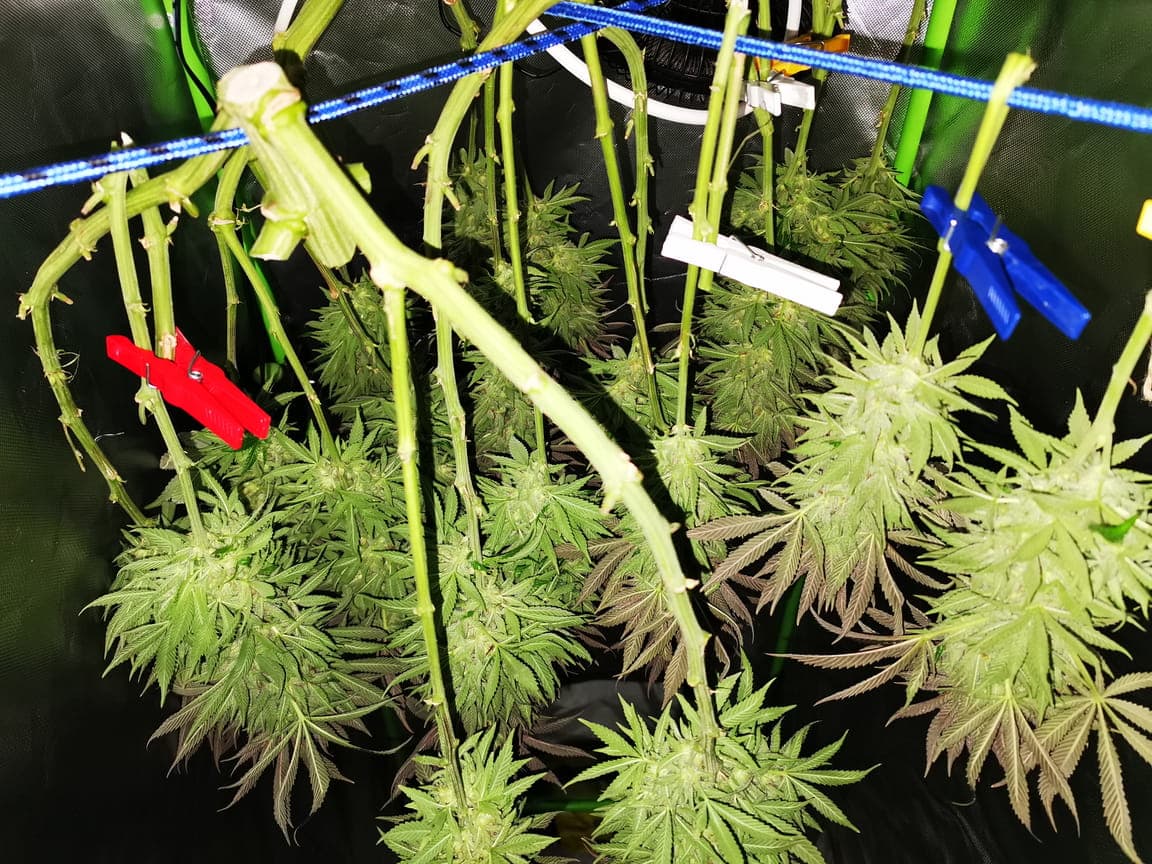 Thondra wenn der Stamm waagerecht gebogen wird, animiert das die Pflanze viele Triebe zu produzieren. Diese werden dann noch ein bißchen zur Seite gebogen um das Zelt gleichmäßig zu füllen.