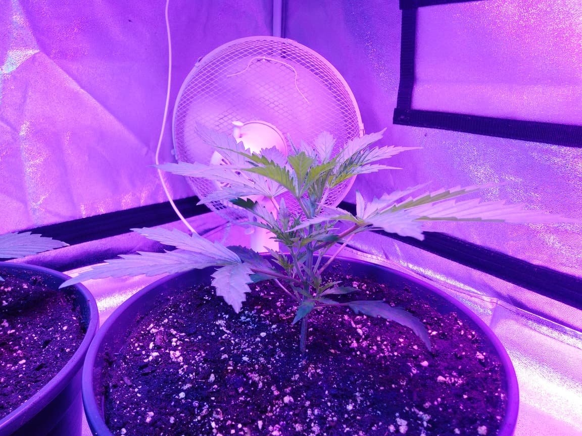 11L Schuhe , Angegossen habe ich dann mit 1L abgestandenem Leitungswasser . Lampen sind 45 cm über Blattspitze . Zwei kleine Ventis oben und ein großer unten Richtung Wand blasend .