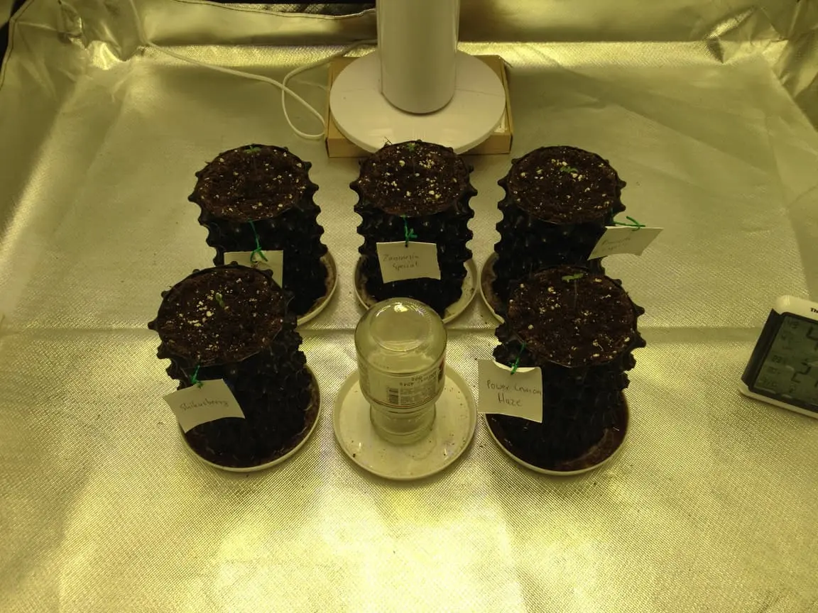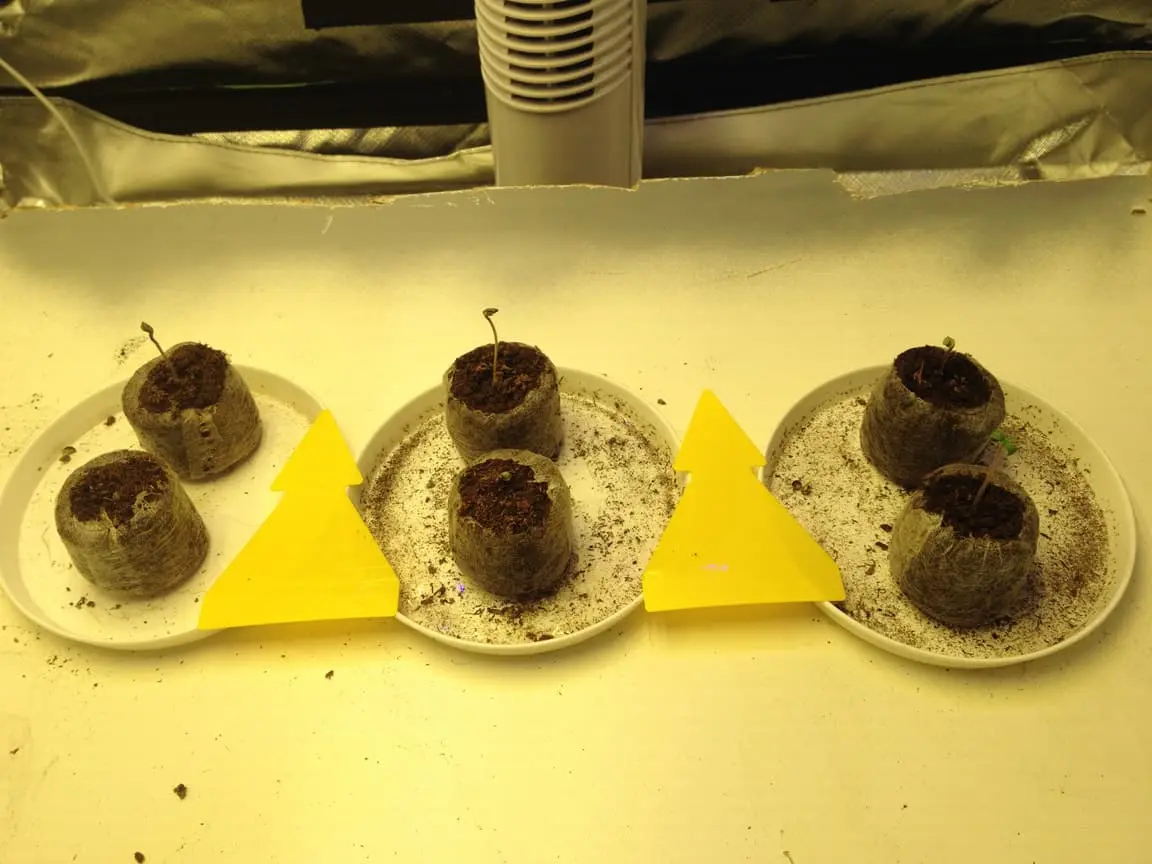 Bei allen 5 guckt auch schon ein Stück der Wurzel aus dem Jiffy.