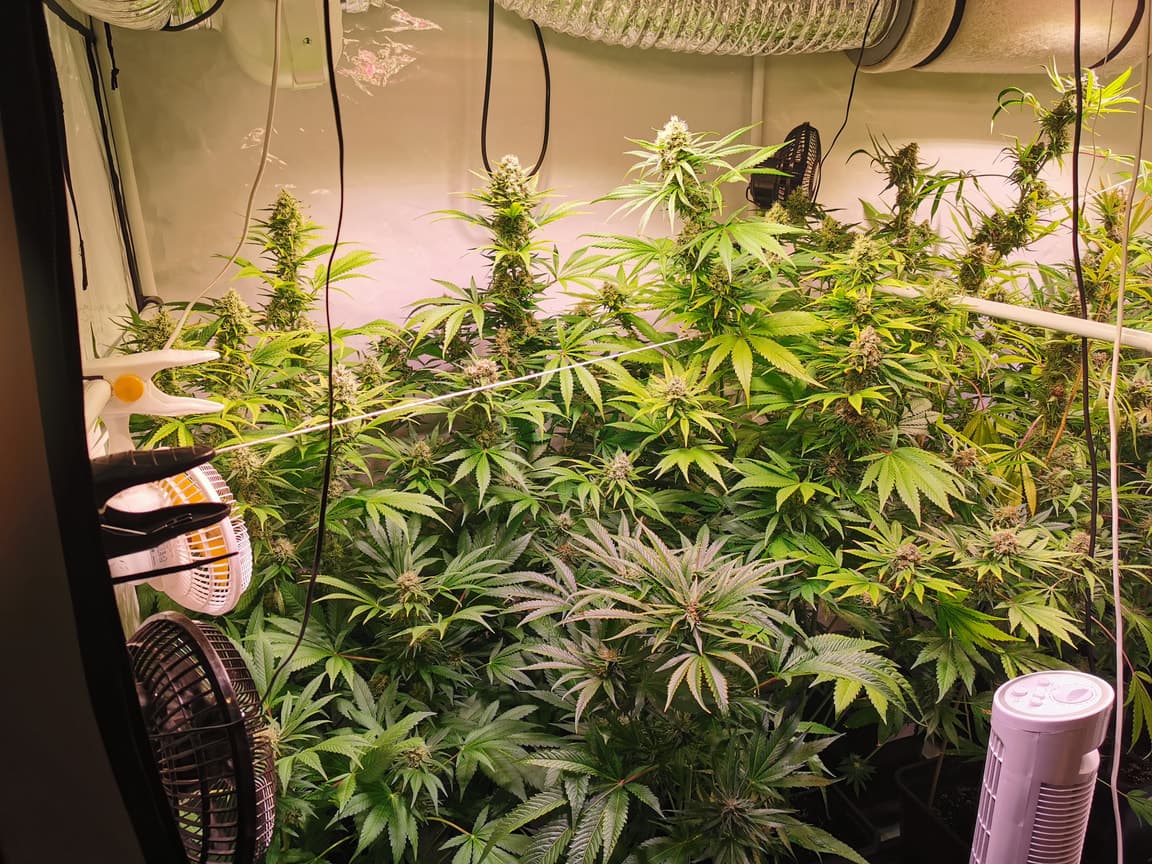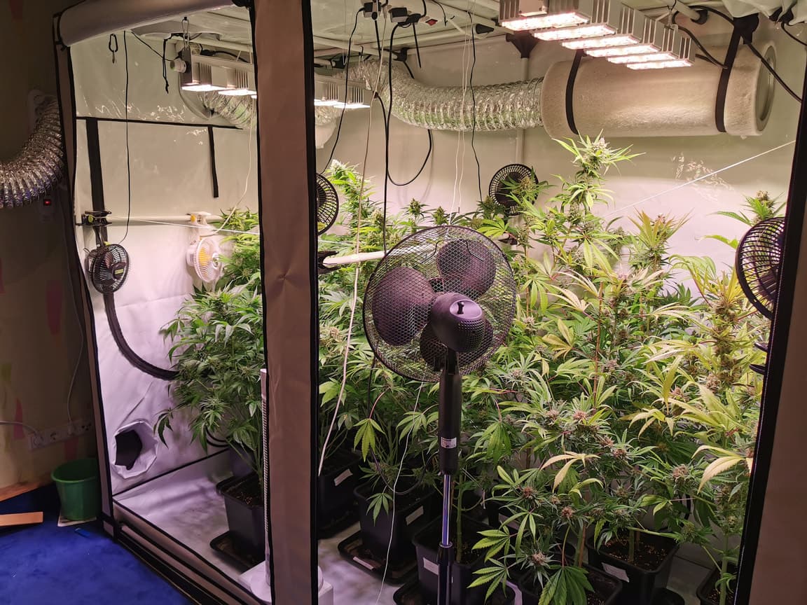im growraum selbst ist das fenster ja zu ... hab jetzt den abluftschlauch vom kleinen zelt an das große angeschlossen und leite die abluft direkt zum fenster raus. alle anderen türen und fenster im 1.og sind offen ... RLF ist bereits runter gegangen