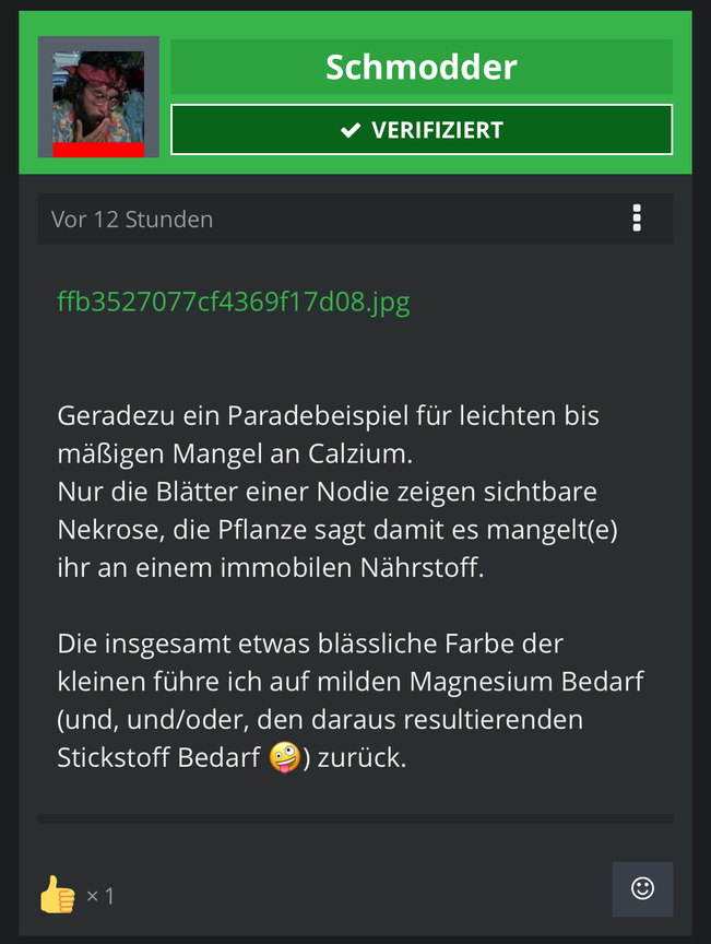 Ich habe das Problem ja bei jedem Grow (EC vom LW ist < als 0,2) und eine Erhöhung der Dosis beim CalMag beseitigt es auch jedes Mal. Deshalb und vom Schadbild schließe ich auf zu wenig Calzium. LW hat 13mg/l Ca und 4mg/l Mg.