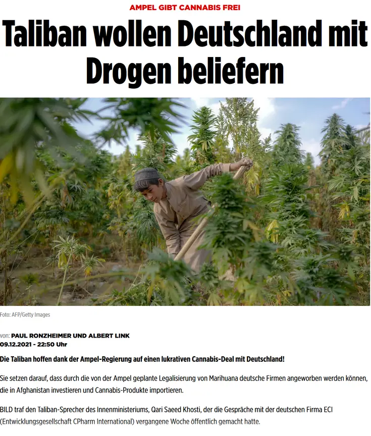 Sie setzen darauf, dass durch die von der Ampel geplante Legalisierung von Marihuana deutsche Firmen angeworben werden können, die in Afghanistan investieren und Cannabis-Produkte importieren.