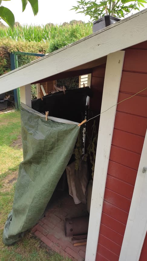 Dieses Jahr trockne ich in nem offenen Seitenfach des Gartenhäuschens. Ich versuche es so kühl, schattig und luftig wie möglich zu halten. Bei der Hitze heute (35-40°C) habe ich alles kurzfristig in die Garage gehängt.