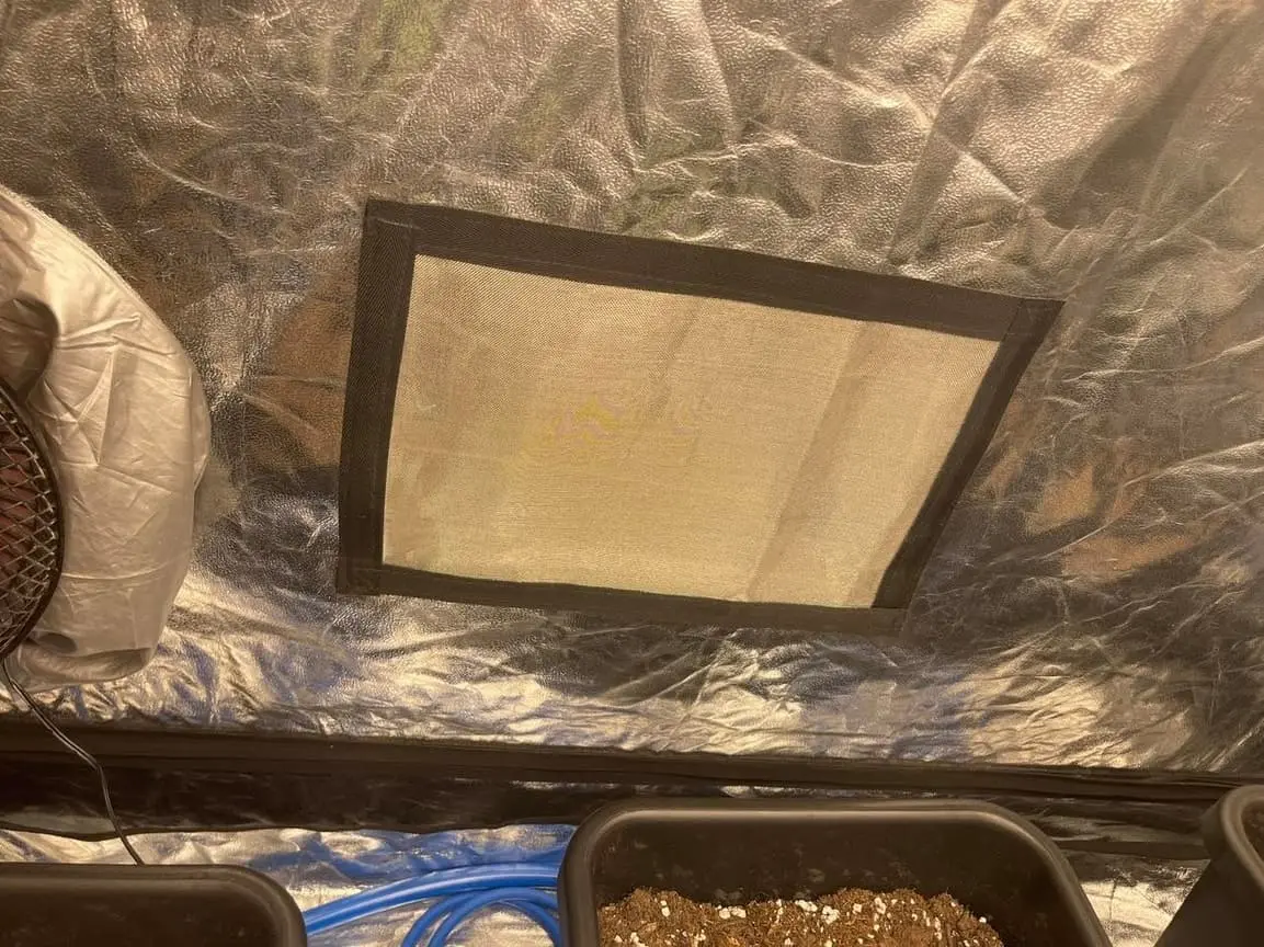 Meine Growbox hat auf der linken Seite den Frischluftzugang der mit einem Insektengitter geschützt ist.