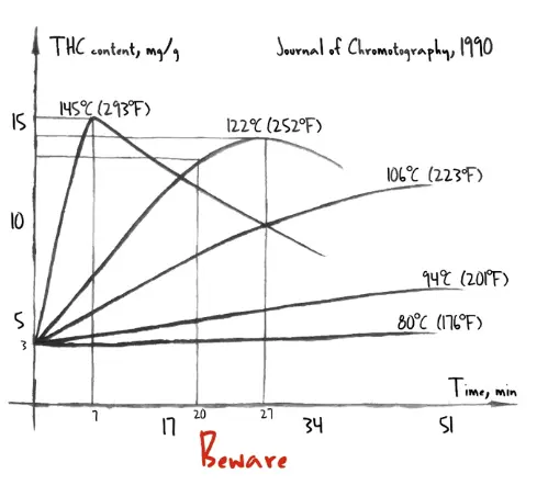 Es gibt ne Tabelle und diese präzise Empfehlung bezieht ggf den Zerfall zu CBN, der durch die Wärme ja schneller passiert, mit ein. Weil ansonsten ist das decarboxilieren etwas, das binnen drei Monaten auch bei Raumtemperatur passiert.