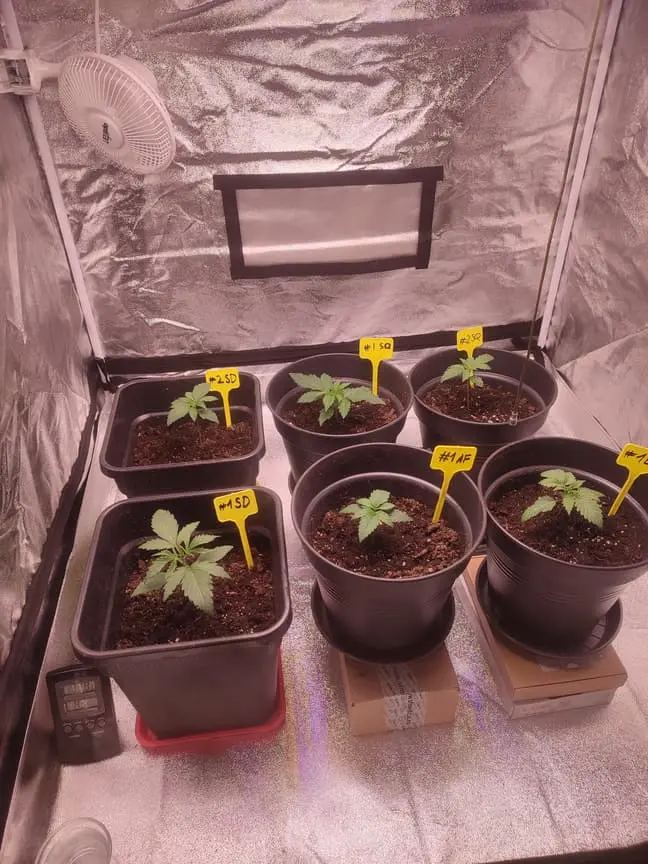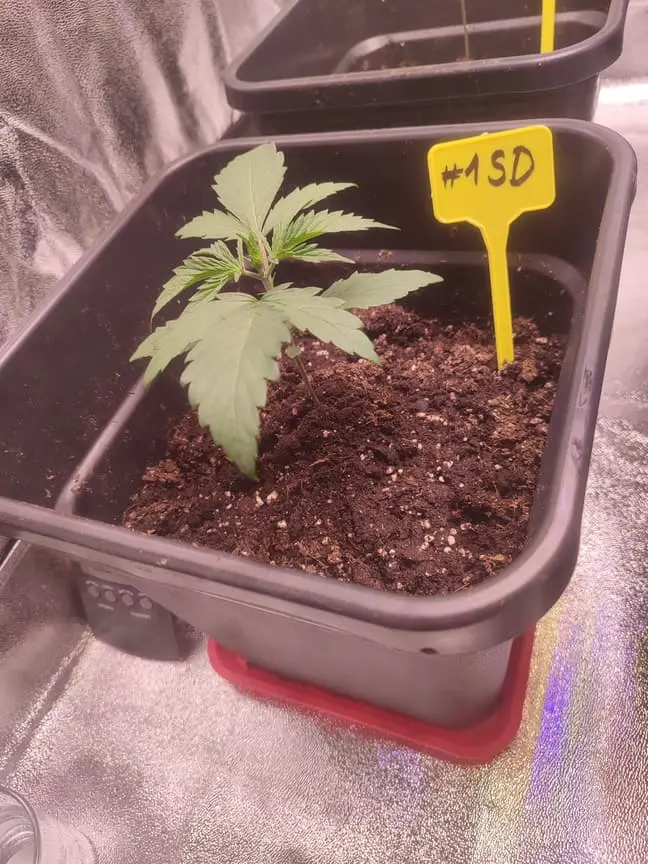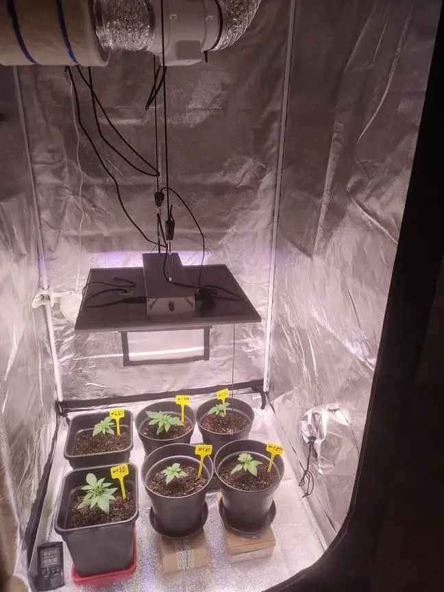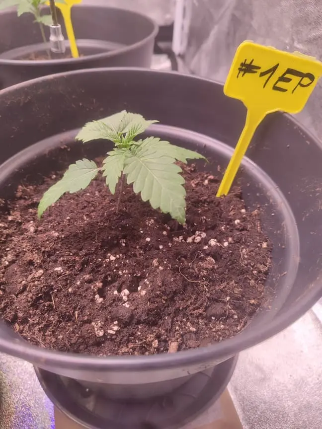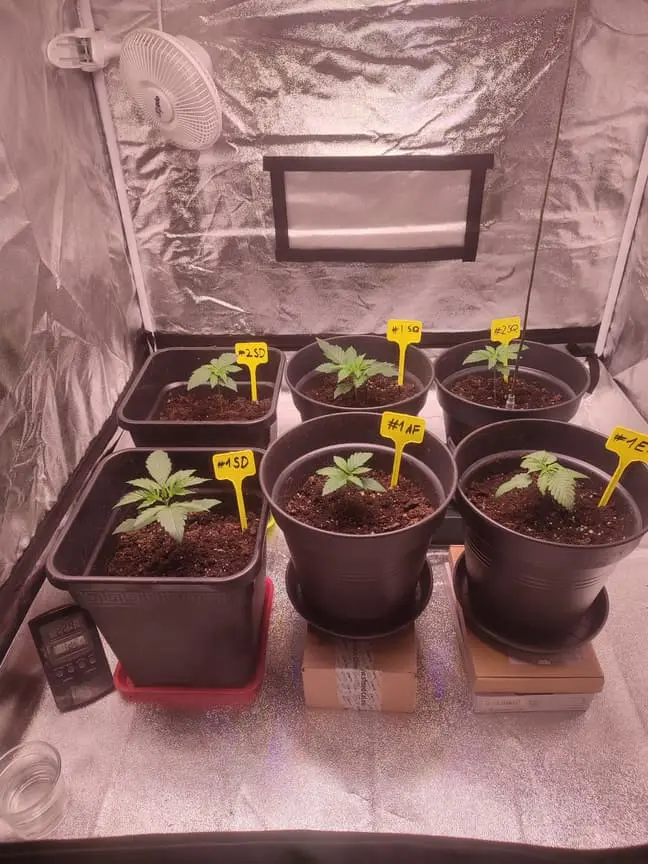 - Alle 13 Pflanzen aus dem Zelt geholt, Zelt ausgewaschen und desinfiziert, die 7 großen (unbekannten) zur Seite gestellt, die 6 kleinen (bekannten) komplett von Erde entfernt, Wurzelwerk leicht abgespült und frisch wie auch steril eingetopft.