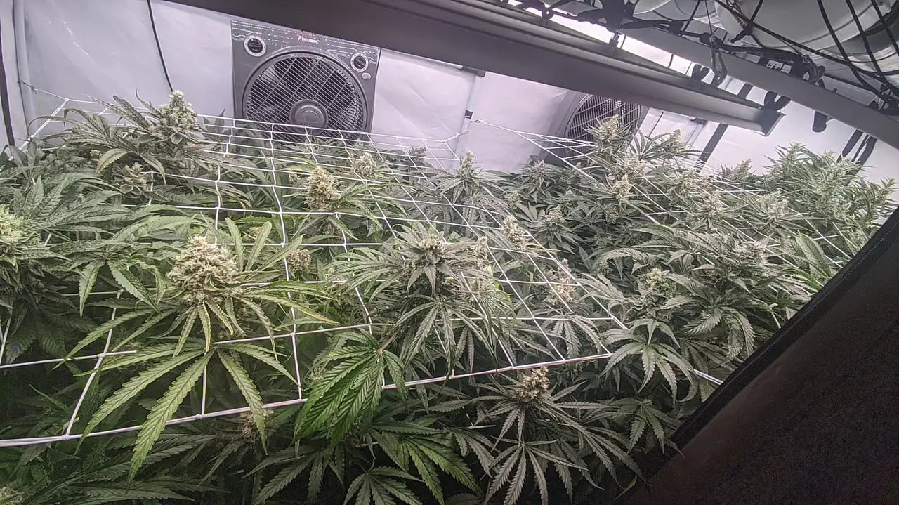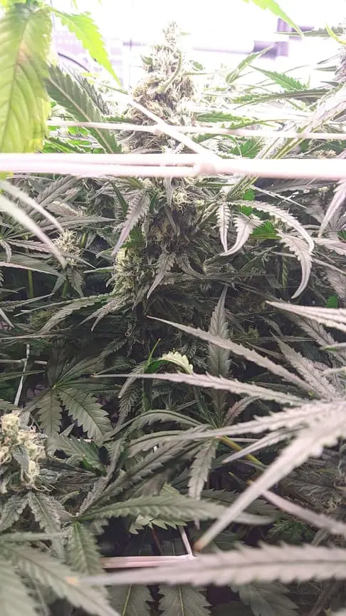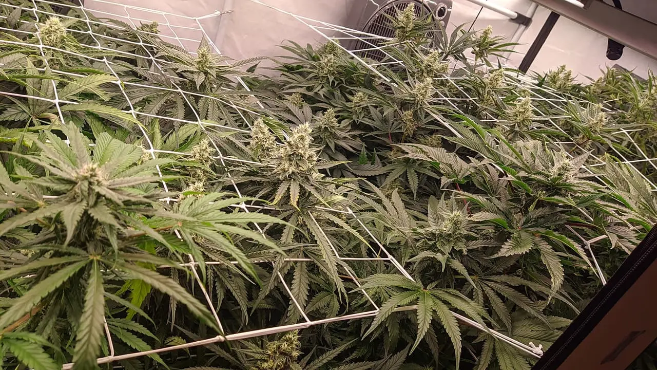 Links sind ca 800-900 μmol und Rechts 1000μmol (das bleibt auch so, mehr macht eh kein Sinn ohne CO2), Temps die letzten Tage 28-29 und RLF 57-60. Das fimmen hat super funktioniert, überall Buds, das wird geil 😍