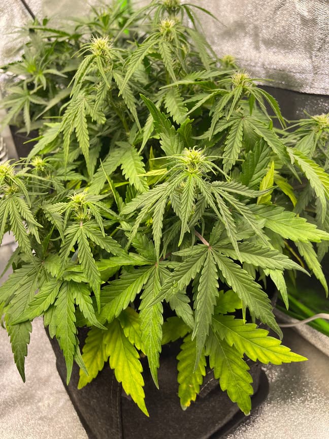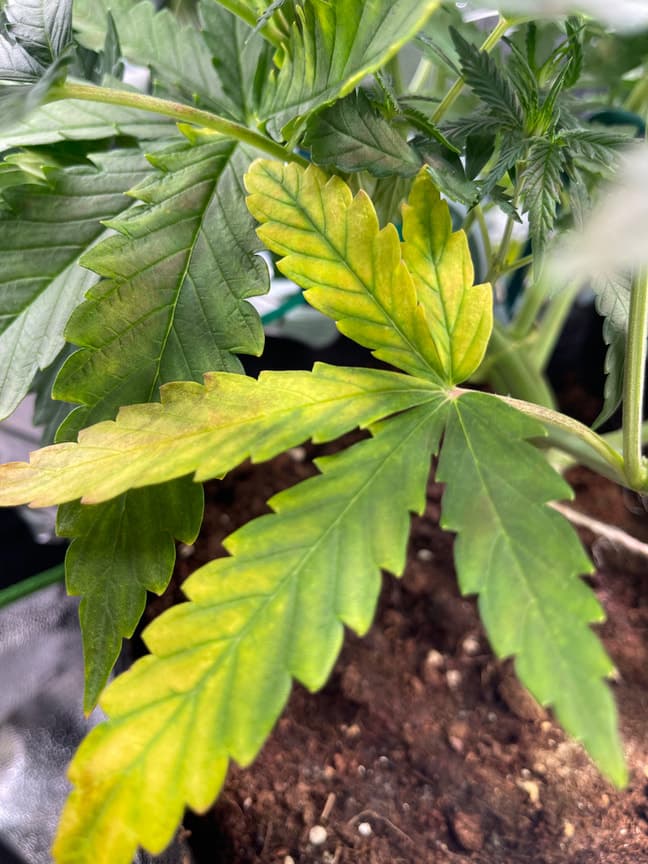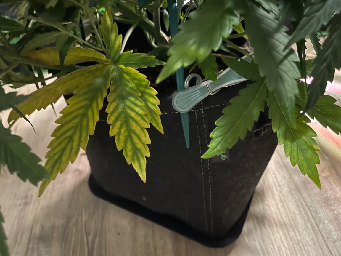 Die Pflanze fängt an mobile Nährstoffe zur Blüte hin zu verlagern, die unteren Speicherblätter verabschieden sich jetzt, ist normal in der Phase.